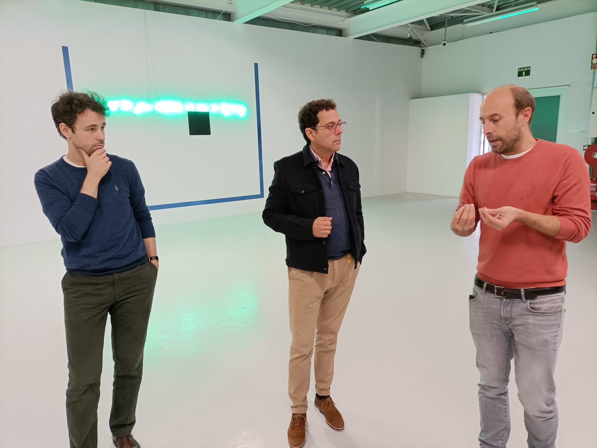El artista Michal Martychowiec (1i), el director general del Instituto de la Industrias Culturales y las Artes (ICA), Manuel Cebrián, y el comisario de Blueproject Foundation, Aurélien Le Genissel (1d), en la visita de hoy al montaje de la exposición