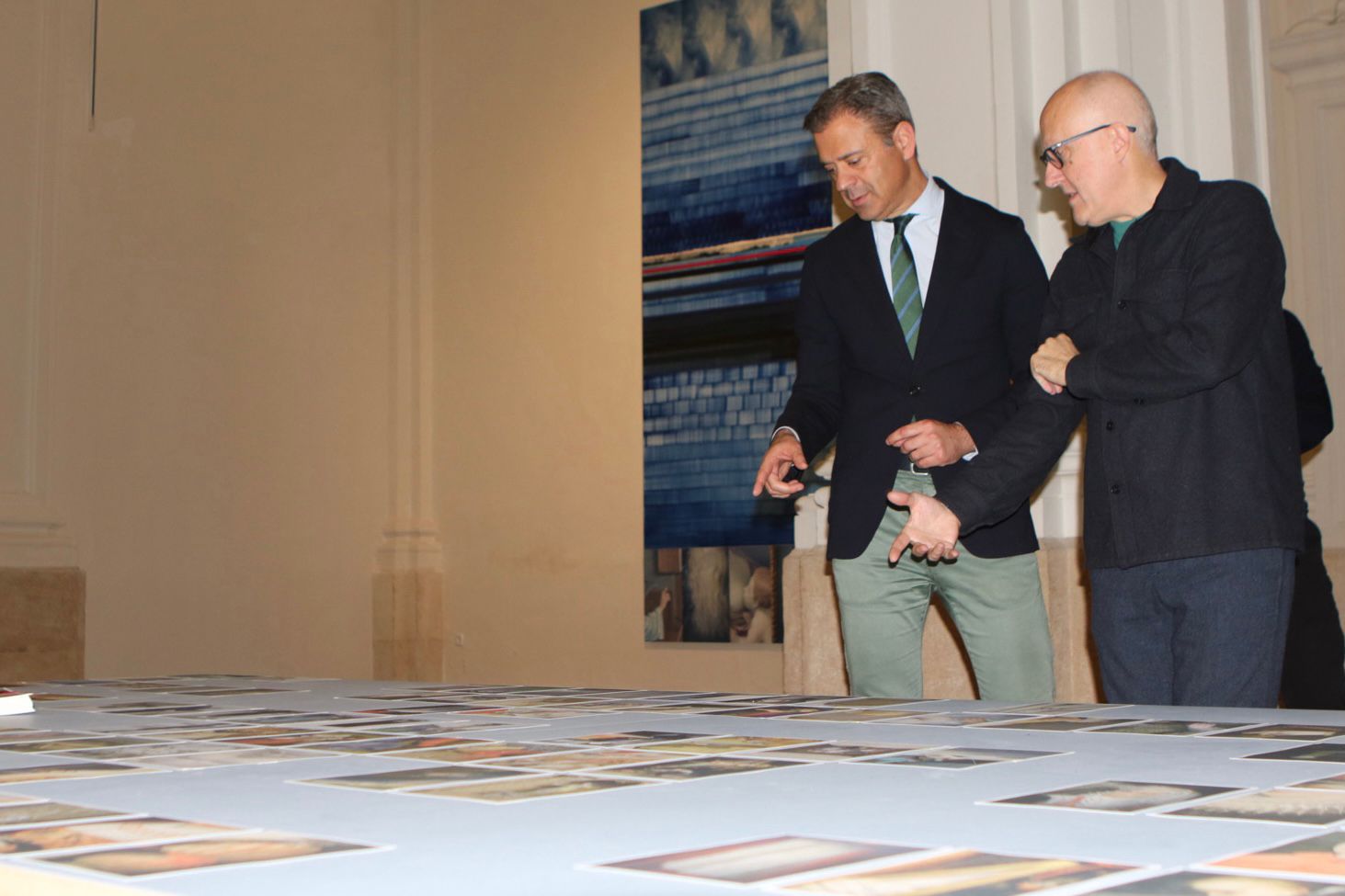 El consejero de Presidencia, Turismo, Cultura, Juventud, Deportes y Portavocía, Marcos Ortuño, y el artista Juan Uslé, observan algunas obras de la muestra