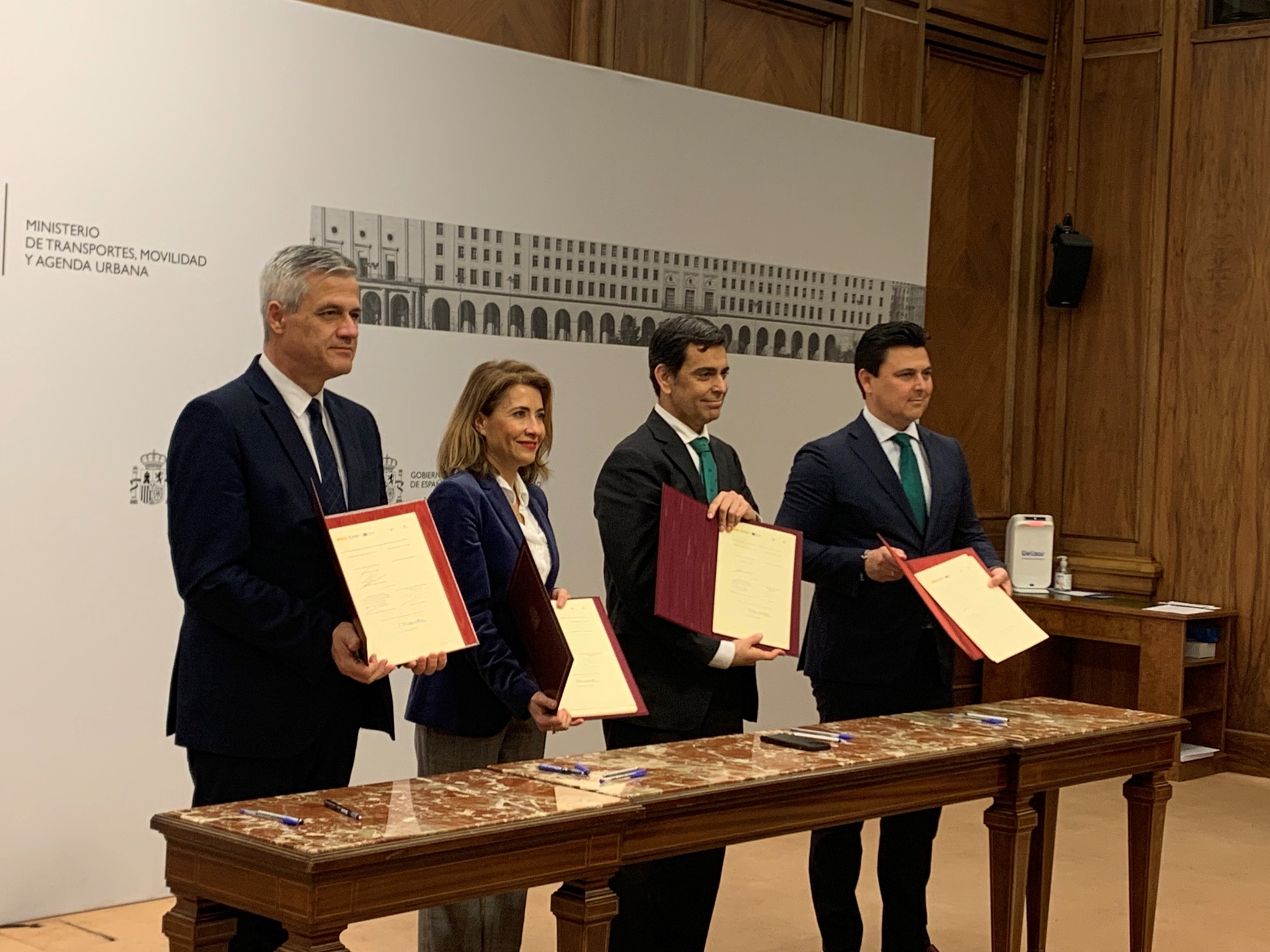 El consejero de Fomento e Infraestructuras, José Ramón Díez de Revenga, junto a la ministra de Transportes, Movilidad y Agenda Urbana, Raquel Sánchez, y el alcalde de San Javier, José Miguel Luengo, tras la firma del acuerdo de financiación para ejecutar los programas de ayudas a la rehabilitación de barrios