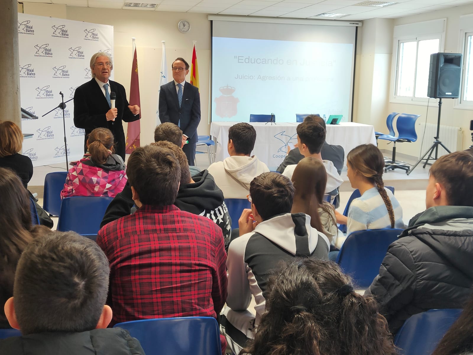 Alrededor de 140 alumnos y alumnas de tercero y cuarto de ESO del centro Majal Blanco de Santomera participaron hoy en la charla extraordinaria del programa ‘Educando en justicia’, que contó con el director general de Atención a la Diversidad, Innovación y Formación Profesional, Juan García Iborra; el fiscal superior de Justicia de la Comunidad Autónoma de la Región de Murcia, José Luis Díaz Manzanera; y con el magistrado del Tribunal Superior de Justicia de la Región, Joaquín Ángel de Domingo, que asistieron a la teatralizaron de un juicio realizada por los alumnos del centro.