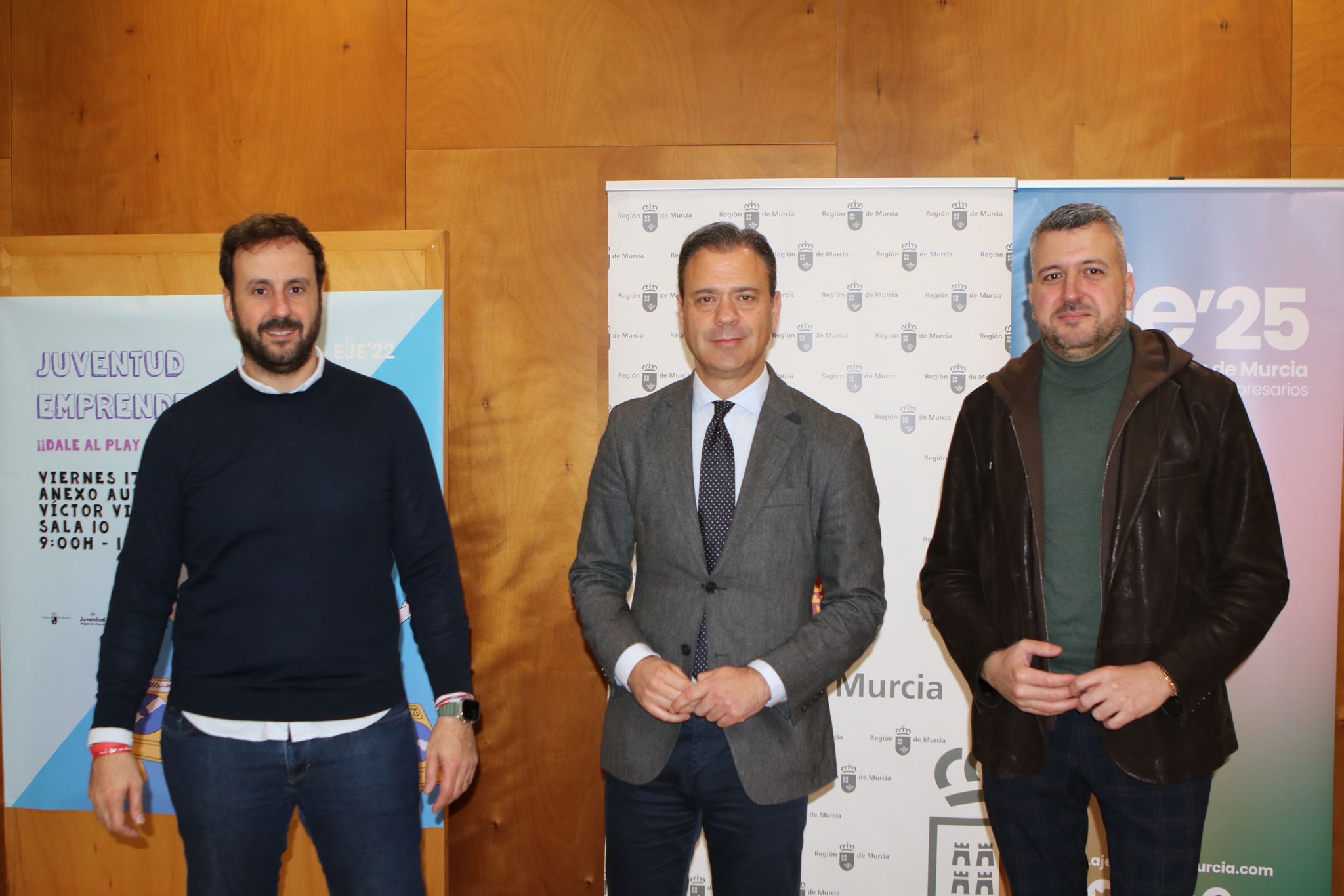 El consejero de Presidencia, Turismo, Cultura, Juventud, Deportes y Portavocía, Marcos Ortuño, junto con el director general de Juventud, José Manuel López, y el presidente de AJE de la Región de Murcia, Ginés Andrés García, antes de comenzar la jornada 'EJE 22'