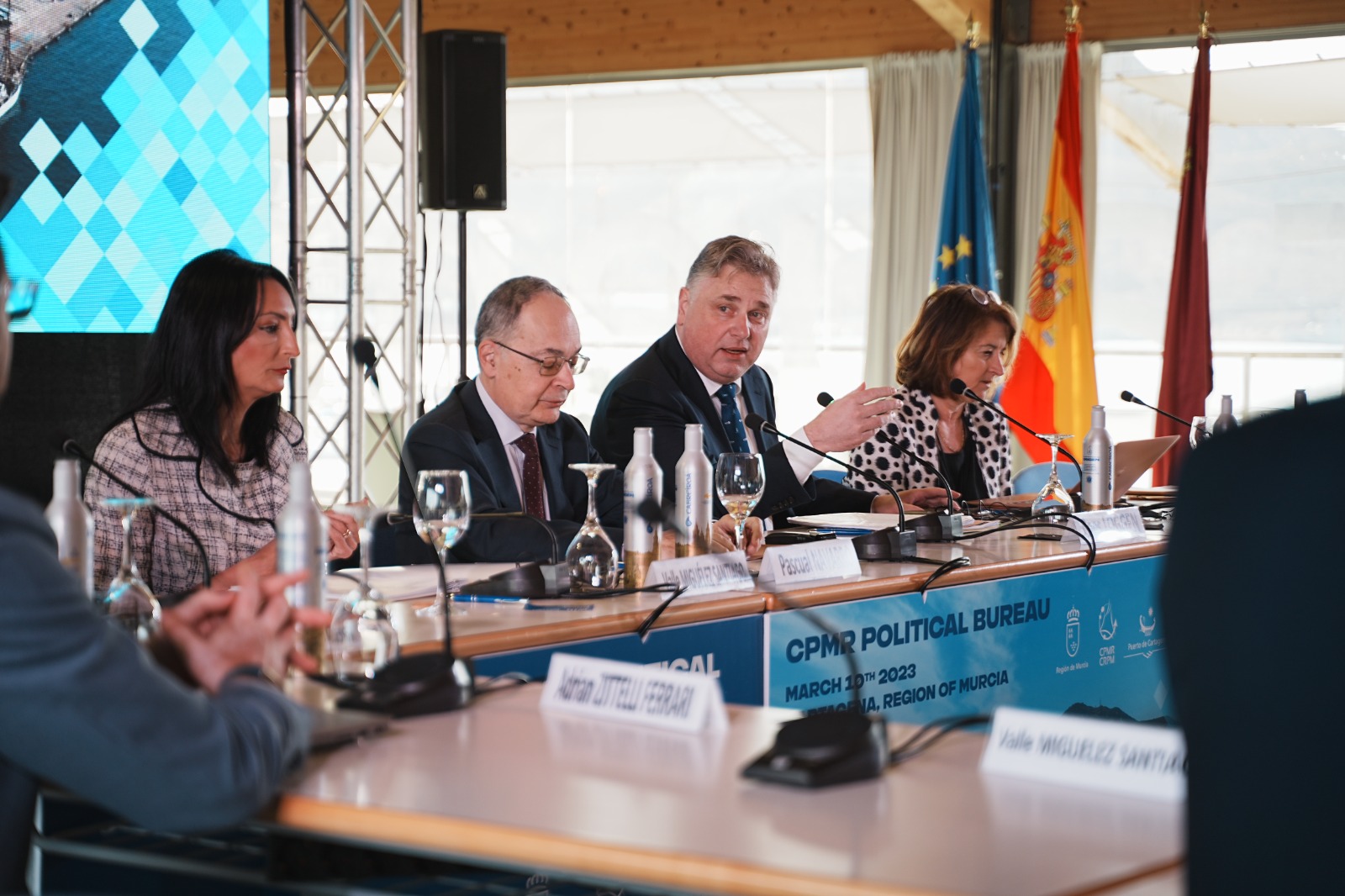 La consejera de Empresa, Economía Social y Autónomos, Valle Miguélez, ha inaugurado el Buró junto con el secretario de Estado para la Unión Europea, Pascual Navarro, y el presidente de la CRPM, Cees Loggen