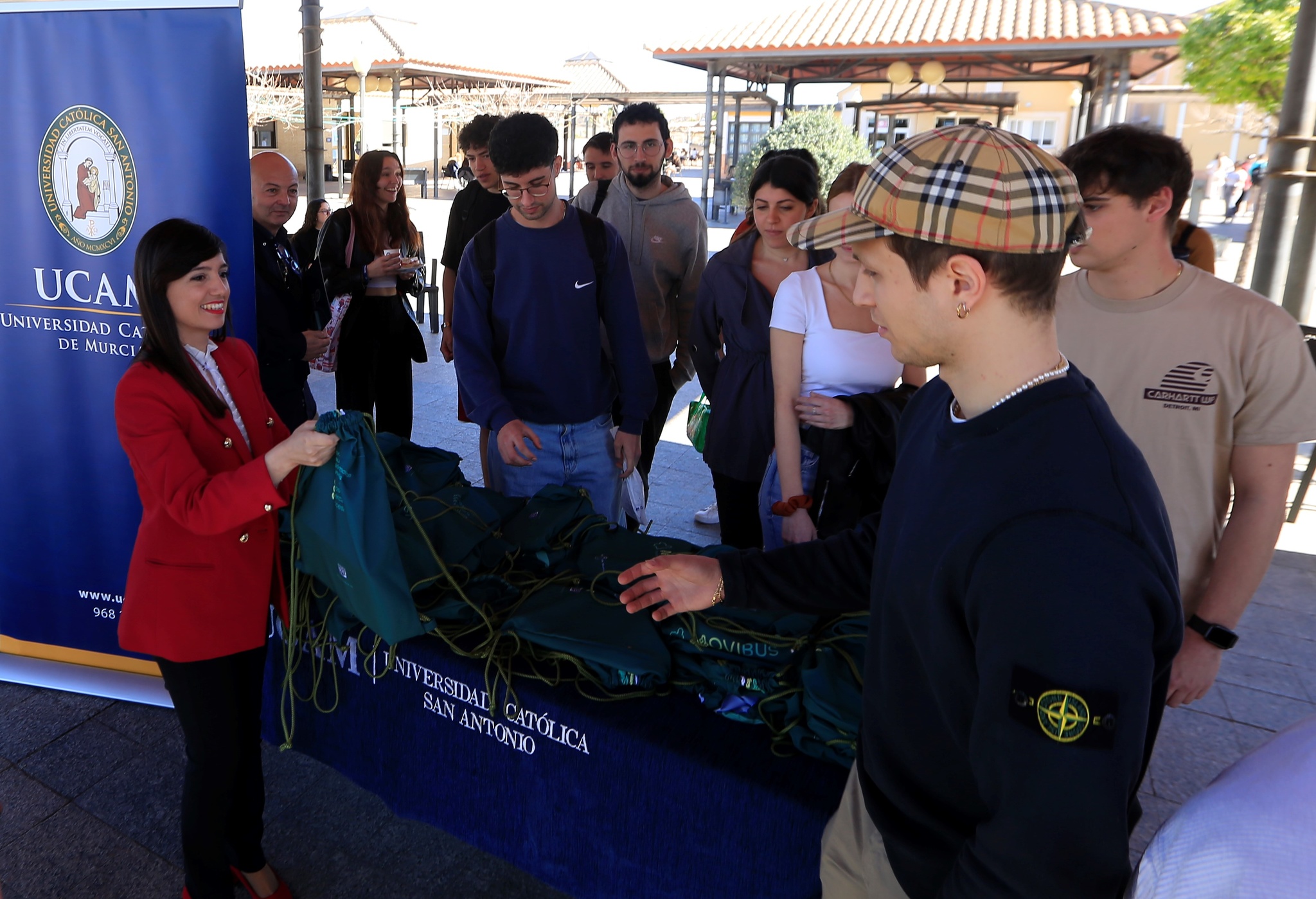 La directora general de Movilidad y Litoral, Marina Munuera, junto con el vicedecano del Grado en Ingeniería Civil de la UCAM, Pedro de los Santos Jiménez, promociona el nuevo modelo de transporte público 'Movibus' entre los estudiantes del centro universitario
