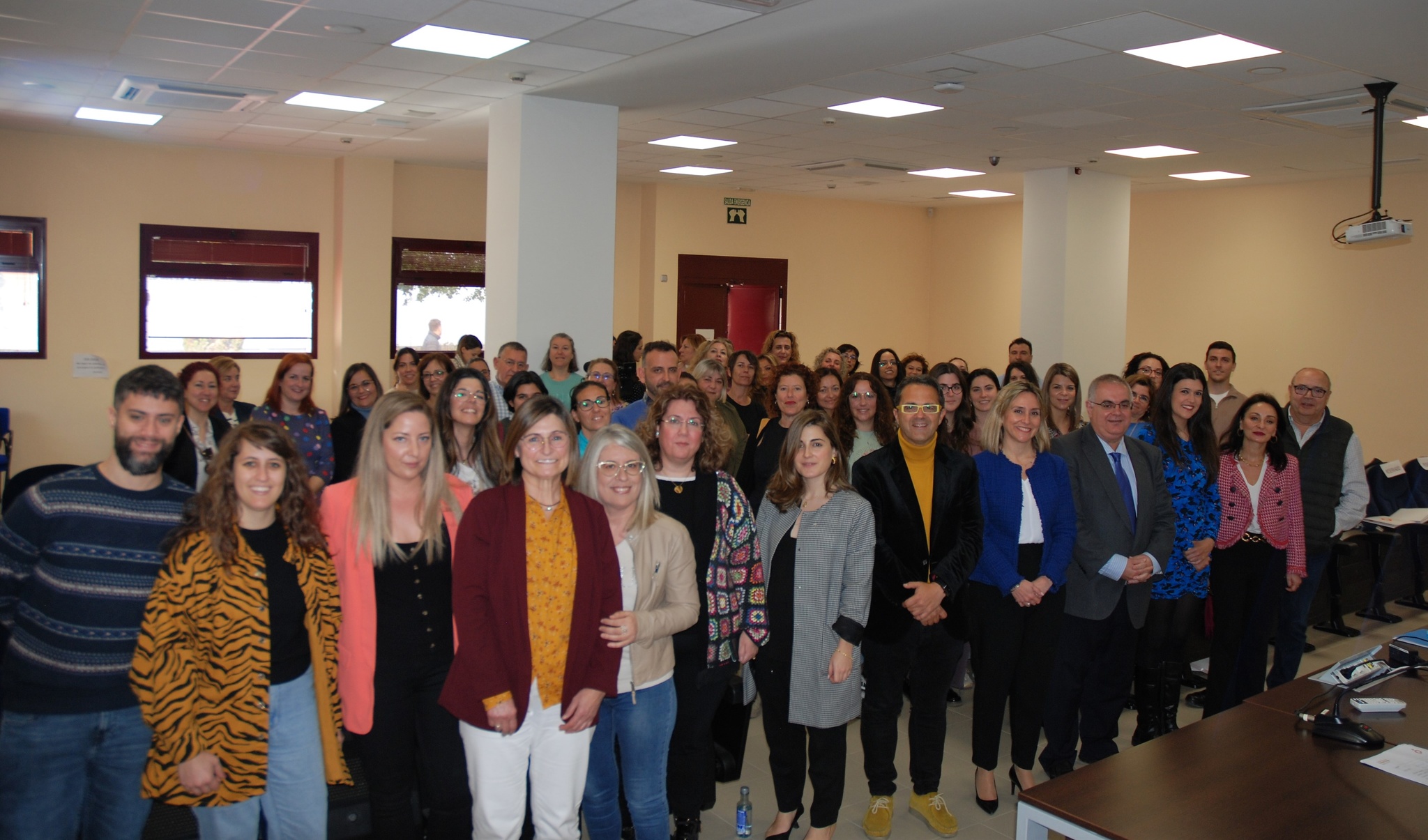 La consejera de Política Social, Familias e Igualdad, Conchita Ruiz Caballero, junto al presidente del Colegio Oficial de Trabajo Social de la Región de Murcia, Juan Carrión Tudela, los directores generales del área y todos los participantes, presenciales, en la jornada de información