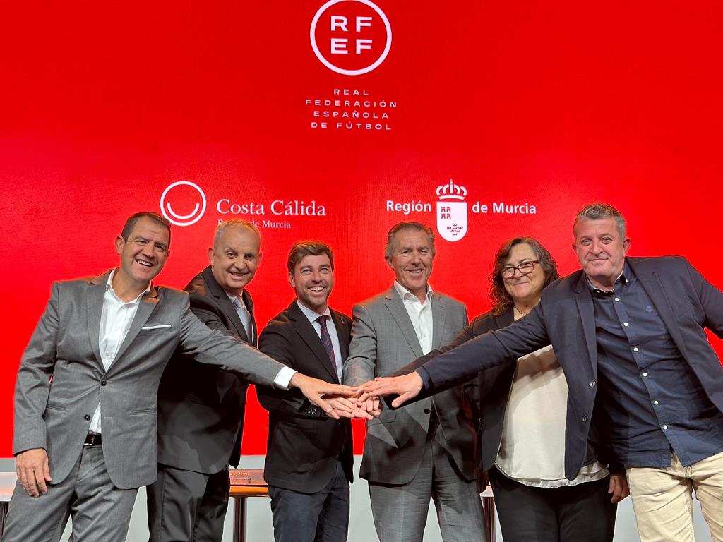 El director general de Deportes, Francisco Javier Sánchez, y el presidente del Comité Nacional de Fútbol Sala, José Miguel Monje, junto con los representantes de ElPozo Murcia Costa Cálida, del Jimbee Cartagena, del Stv Roldán y de La Boca Te Lia Futsal Alcantarilla, tras dar a conocer el acuerdo