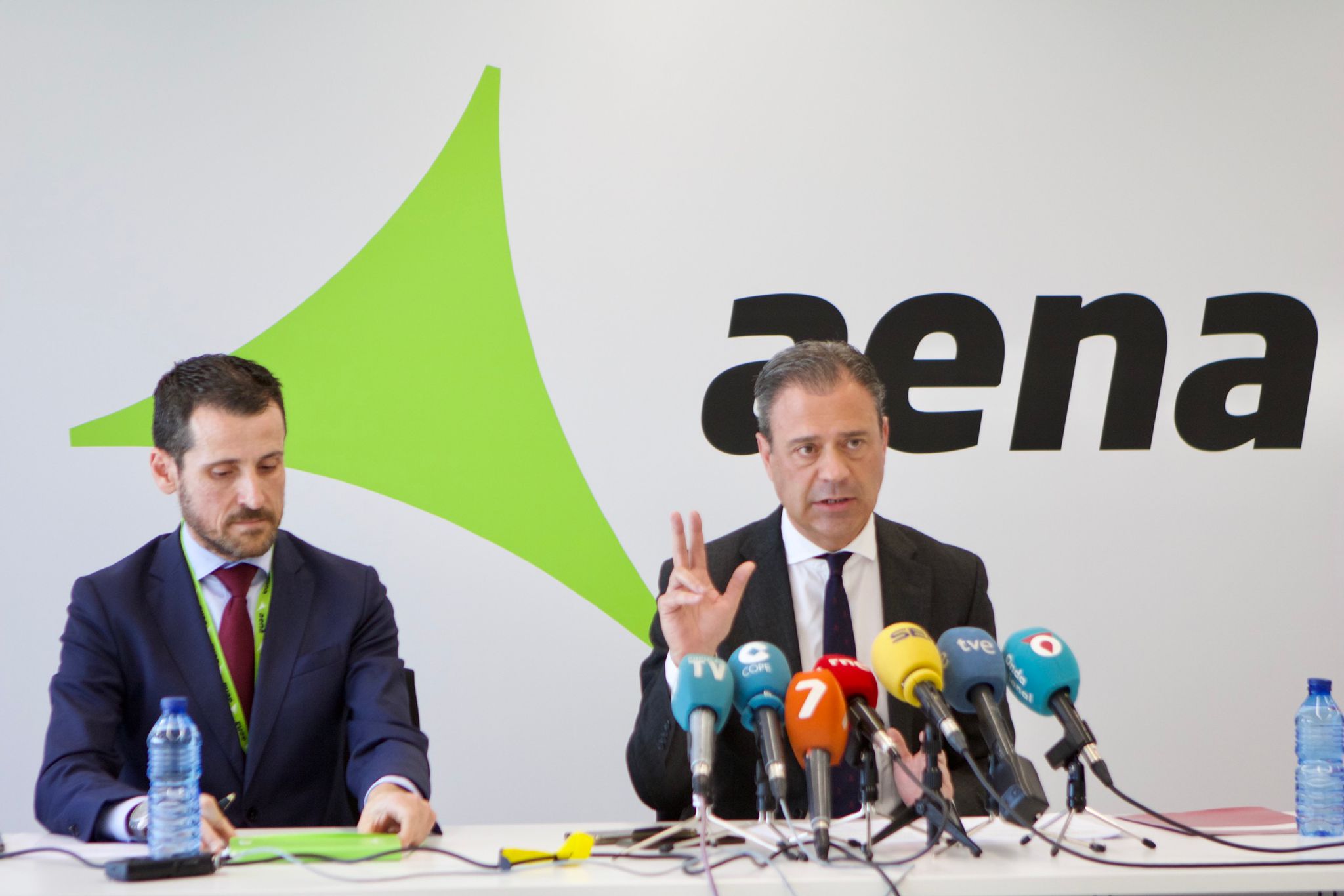 El consejero de Presidencia, Turismo, Cultura, Juventud, Deportes y Portavocía, Marcos Ortuño, y el director general de la Sociedad Concesionaria del Aeropuerto Internacional Región de Murcia, Carlos Domingo San Martín, en su comparecencia ante los medios de comunicación