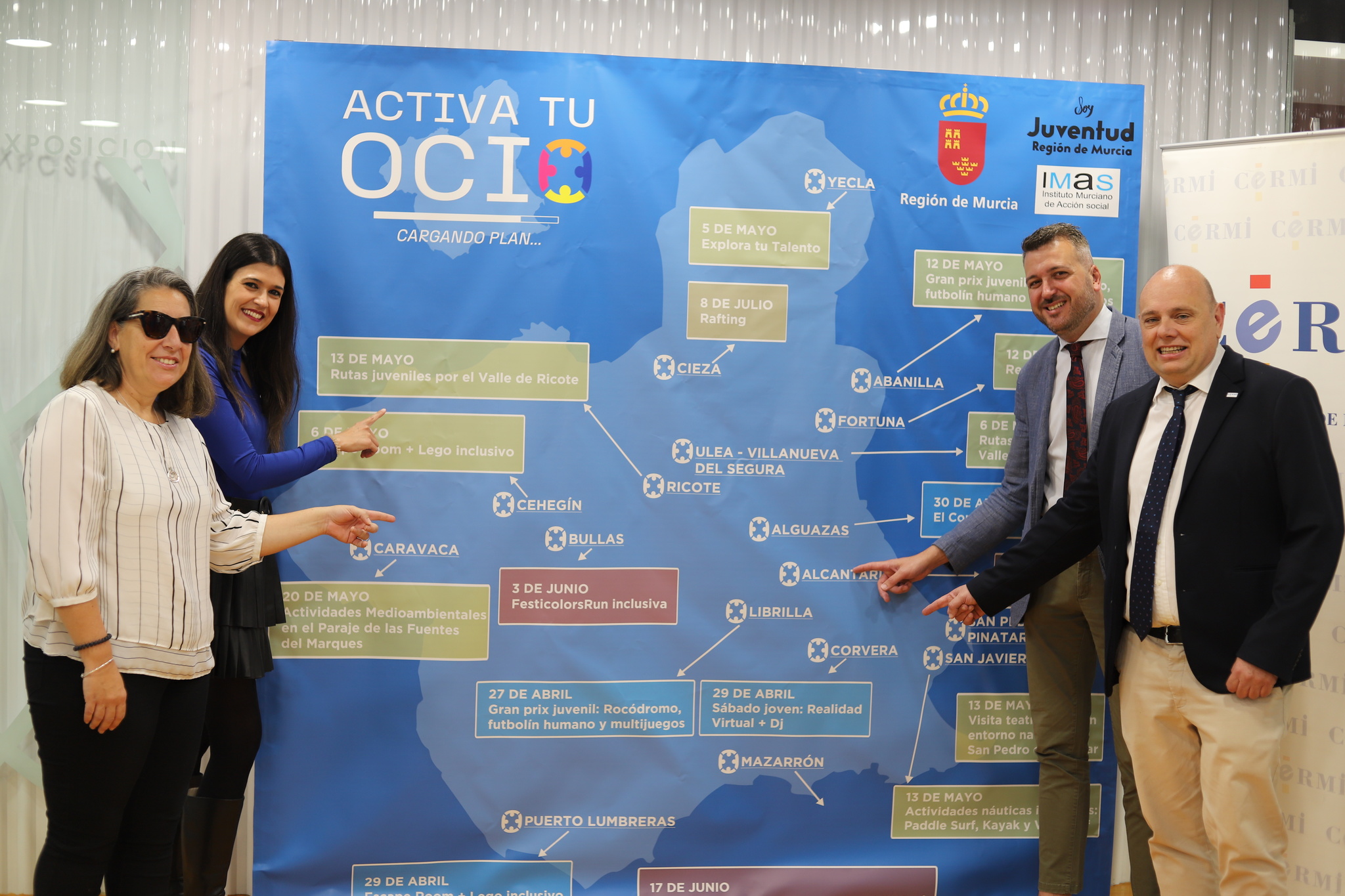 El programa, que presentaron hoy los directores generales de Juventud, José Manuel López, de Personas con Discapacidad, Miriam Pérez, acompañados por el presidente del CERMI, Pedro Martínez, comenzará el 27 de abril en Librilla y se prolongará durante 16 jornadas hasta el 8 de julio. Los municipios donde se celebrarán las actividades son Librilla, Puerto Lumbreras, Alguazas, Yecla, Cehegín, Abanilla, Fortuna, San Javier, San Pedro del Pinatar, Ulea y Villanueva del Río Segura, Ricote, Caravaca de la Cruz, Alcantarilla, Bullas, Mazarrón y Cieza.