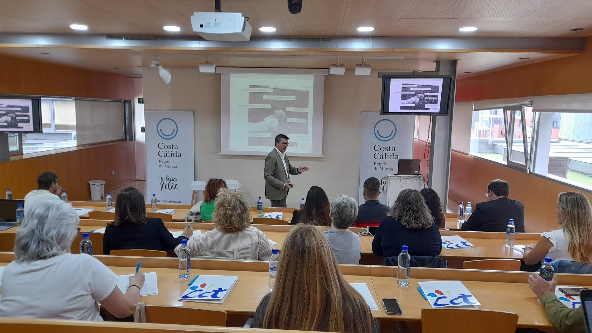 Empresarios, representantes de destinos y mancomunidades de la Región asisten a la parte teórica de la sesión, atendiendo la ponencia de un experto en turismo familiar