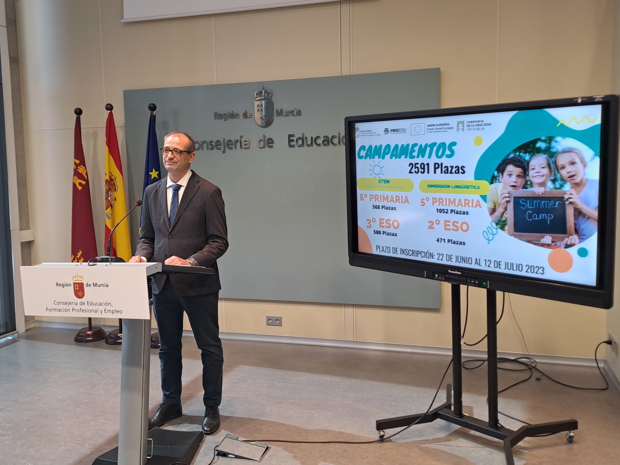 El consejero en funciones de Educación, Formación Profesional y Empleo, Víctor Marín, presentó los campamentos de inglés y Steam para alumnos de Primaria y Secundaria