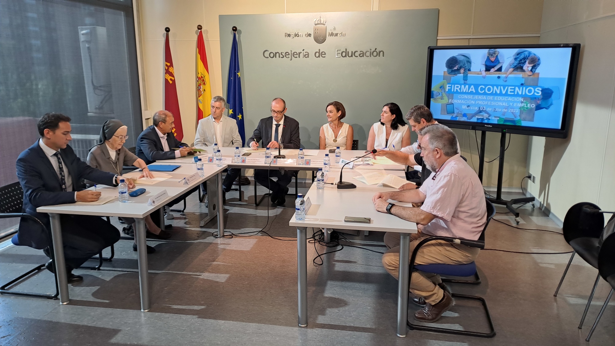 El consejero en funciones de Educación, Formación Profesional y Empleo, Víctor Marín, firmó hoy la renovación de los convenios que regulan el funcionamiento de la enseñanza concertada en la Región, con la participación de las patronales Unión de Cooperativas de Enseñanza Región de Murcia (Ucoerm), Federación Española de Religiosos de Enseñanza (FERE) y Confederación Española de Centros de Enseñanza (CECE), y de los sindicatos UGT, CCOO y la Federación de Sindicatos Independientes de Enseñanza (FSIE).