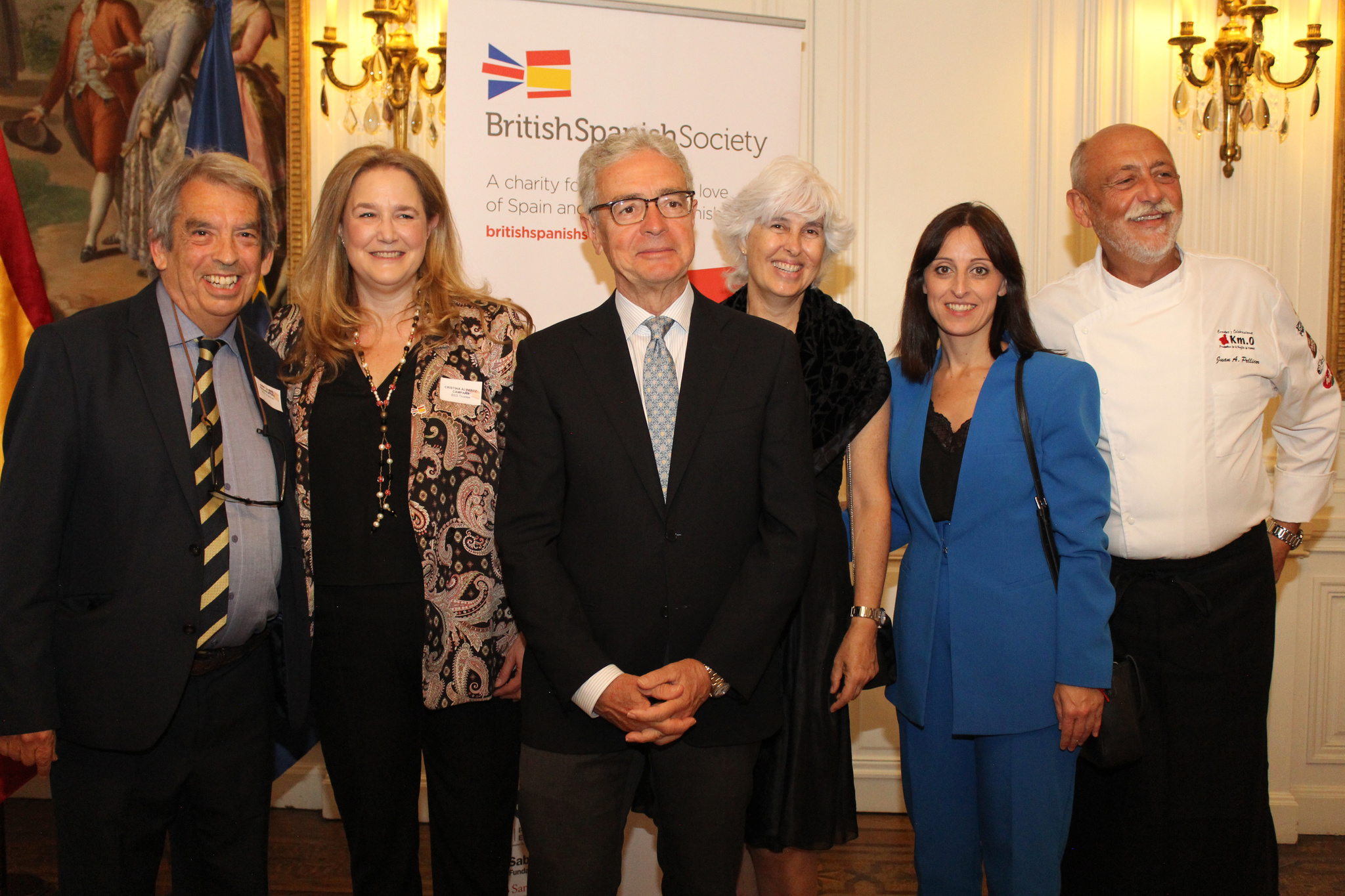 La directora general de Agricultura, Industria Alimentaria y Cooperativismo Agrario, Remedios García (2d), el presidente de la British Spanish Society, Jimmy Burns Marañón (1i), y el embajador de España en Londres, José Pascual Marco (3i), en el evento organizado por la citada sociedad y la Comunidad Autónoma.