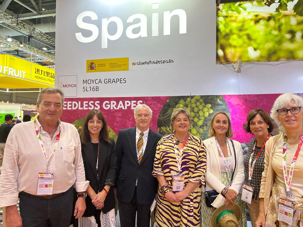 La directora general, Remedios García (2i) y el cónsul de España en Hong Kong, Miguel Aguirre (3i), durante su recorrido por los expositores de la Región