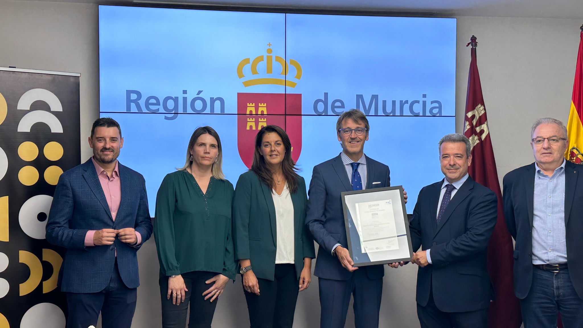 El consejero de Economía, Hacienda y Empresa, Luis Alberto Marín, recibió hoy este sello de calidad de manos del director de Aenor para la región Mediterránea, Ángel Luis Sánchez. Además de este nuevo reconocimiento, la entidad Aenor renovó la certificación de calidad para las 33 oficinas de la red de la Agencia Tributaria en la Región, así como otros servicios de la Agencia enfocados a la ciudadanía como el servicio de información, el de emisión de recibos y cartas de pago, los de registro y asistencia al contribuyente, el servicio de asesoramiento jurídico interno o el de inspección y valoración tributaria.