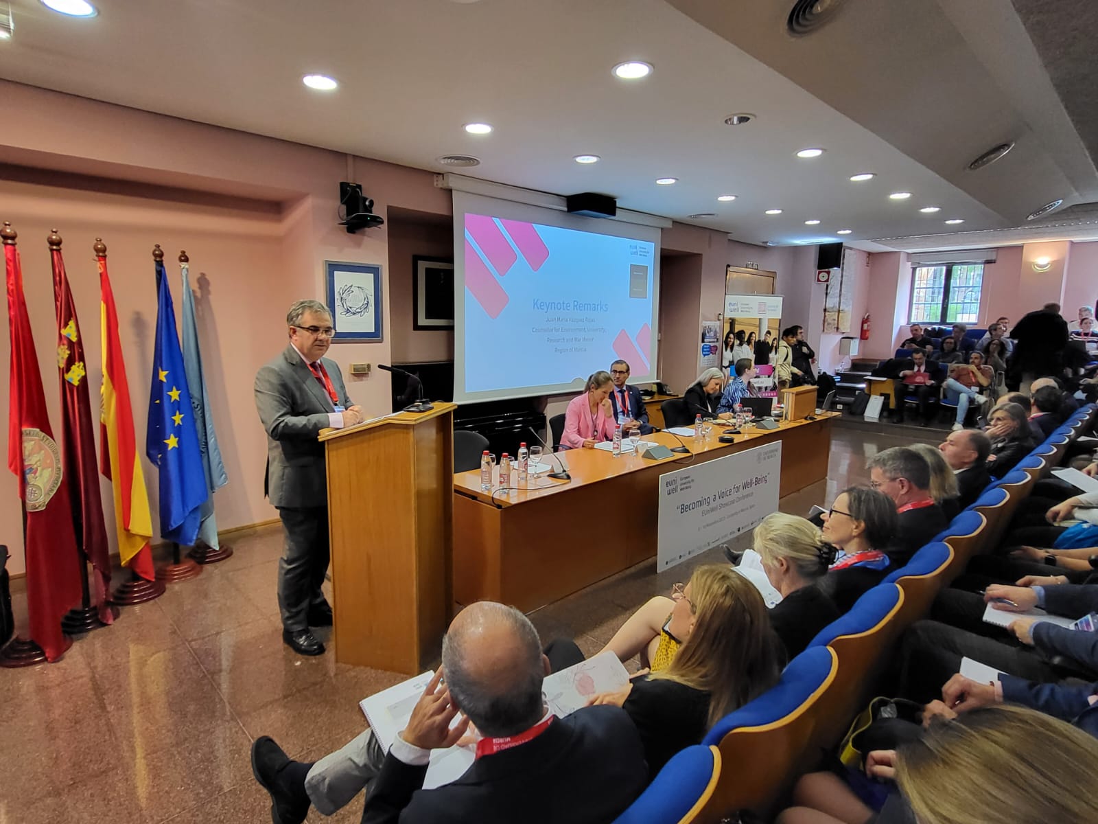 El consejero de Medio Ambiente, Universidades, Investigación y Mar Menor, Juan María Vázquez, intervino hoy en el acto de apertura de la Conferencia de la Alianza Europea de Universidades ‘EUniWell’, celebrado en el Hemiciclo de la Facultad de Letras del campus de la Merced.