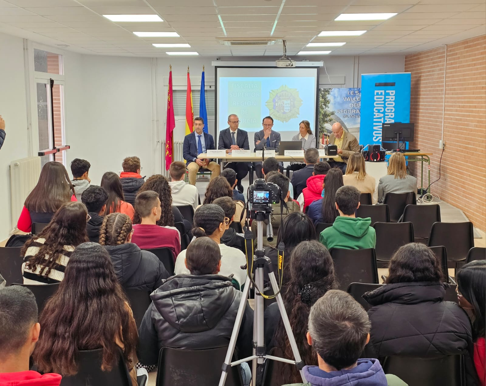 El alcalde de Blanca, Pablo Cano, el consejero de Educación, Formación Profesional y Empleo, Víctor Marín, el fiscal Superior de la Comunidad Autónoma de la Región de Murcia, José Luis Díaz Manzanera, la directora de Recursos Humanos, Planificación Educativa e Innovación, Carmen Balsas, y el director del IES Valle del Segura, Moisés Aguilar, durante la presentación de la primera charla del programa educativo 'El fiscal contigo´ del curso 2023/2024.