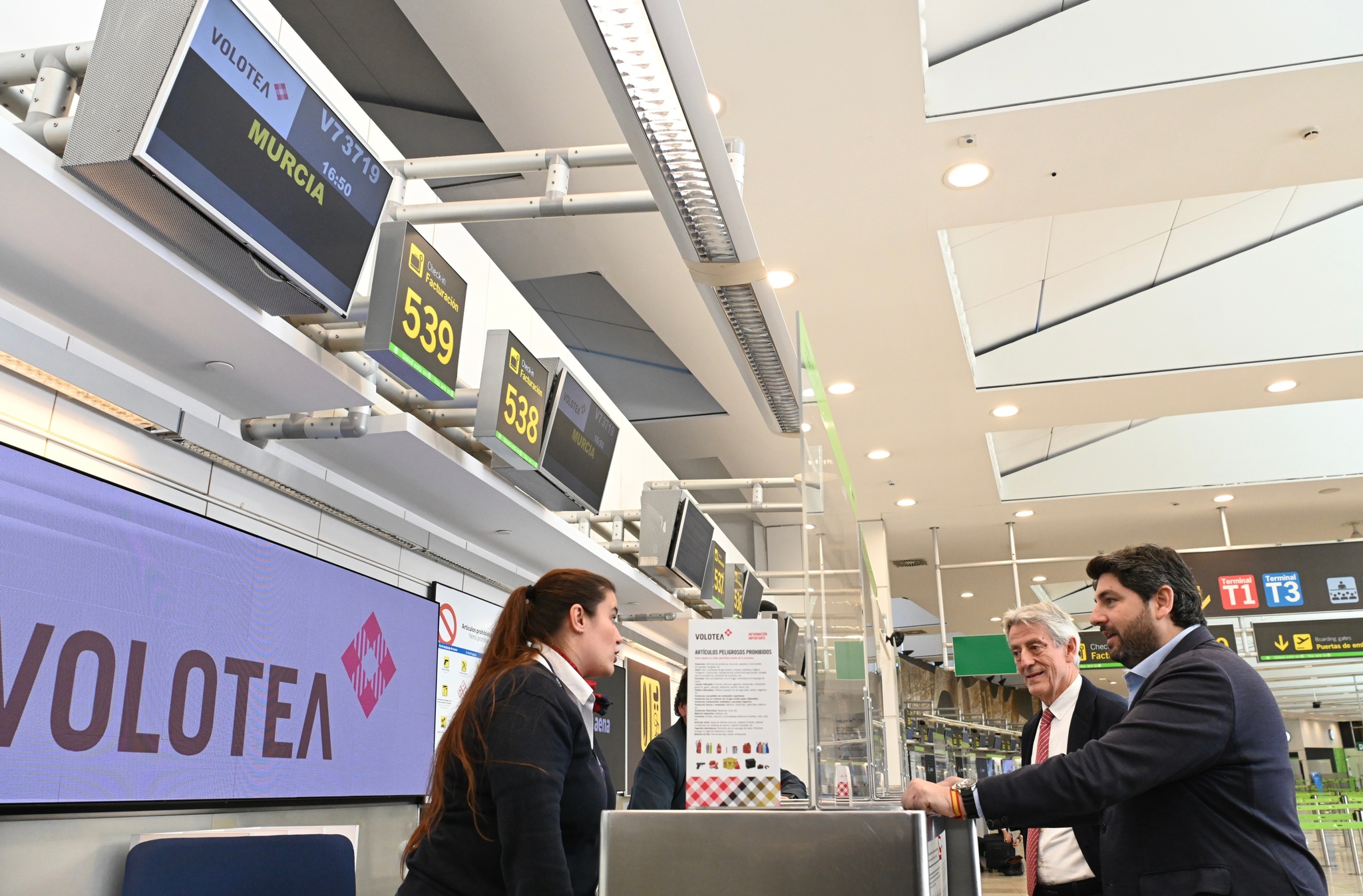 López Miras, junto al cofundador de Volotea, Lázaro Ros, antes de embarcar en el primer trayecto Madrid-Murcia