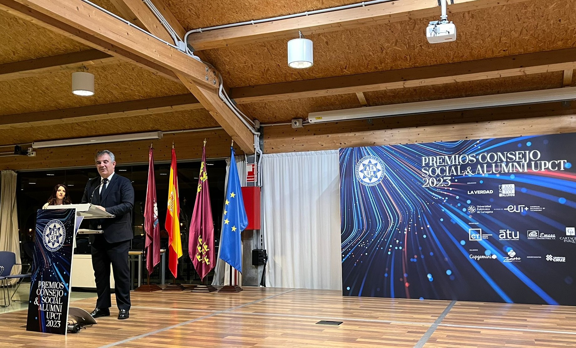 El consejero de Medio Ambiente, Universidades, Investigación y Mar Menor, Juan María Vázquez, clausuró ayer la entrega de los Premios Consejo Social & Alumni UPCT 2023, que se celebró anoche en el Salón de Actos Isaac Peral de la Universidad Politécnica de Cartagena.