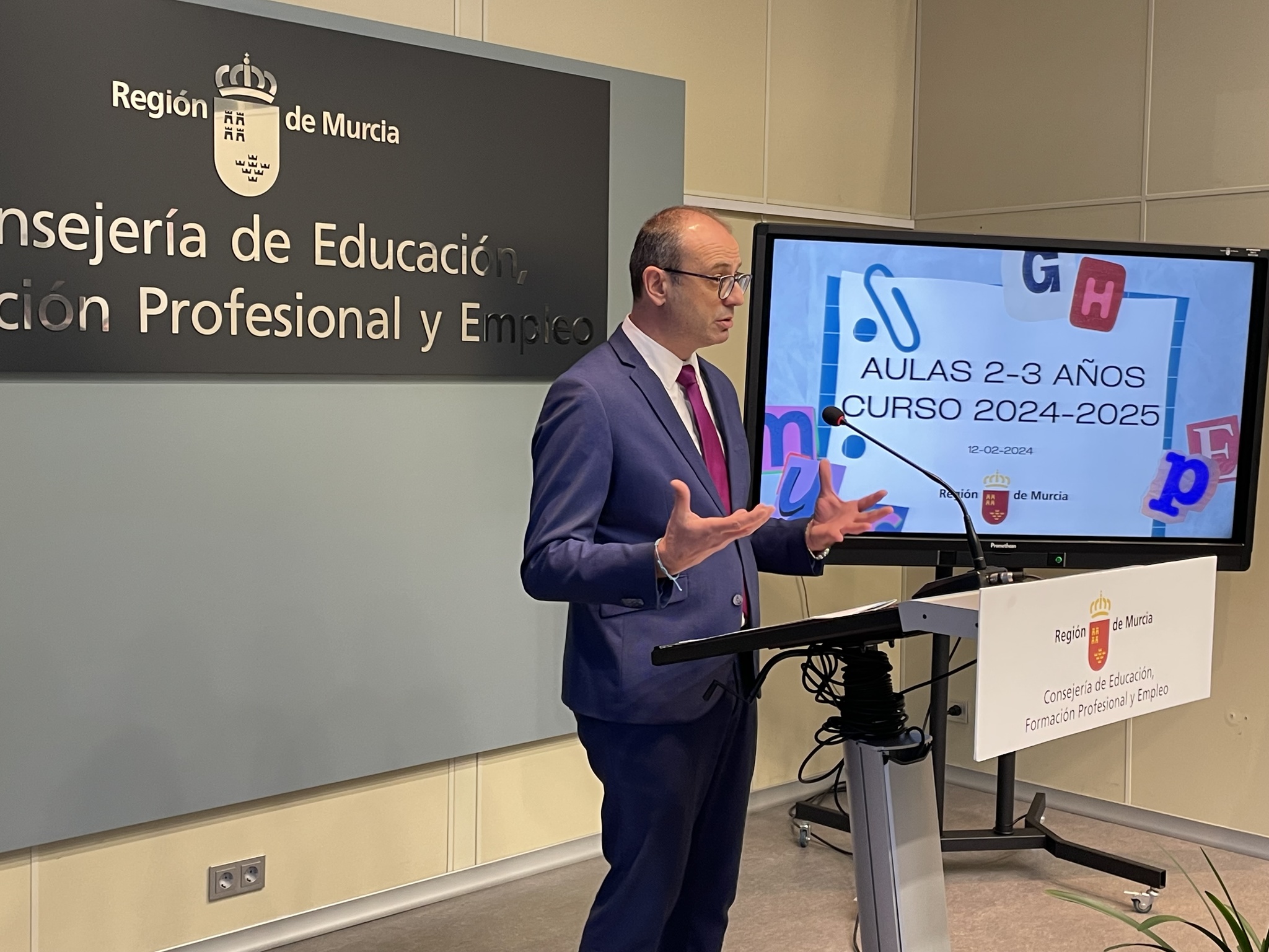 El consejero de Educación, Formación Profesional y Empleo, Víctor Marín, durante la presentación de la oferta de Educación Infantil 2 años para el curso 2024-2025.