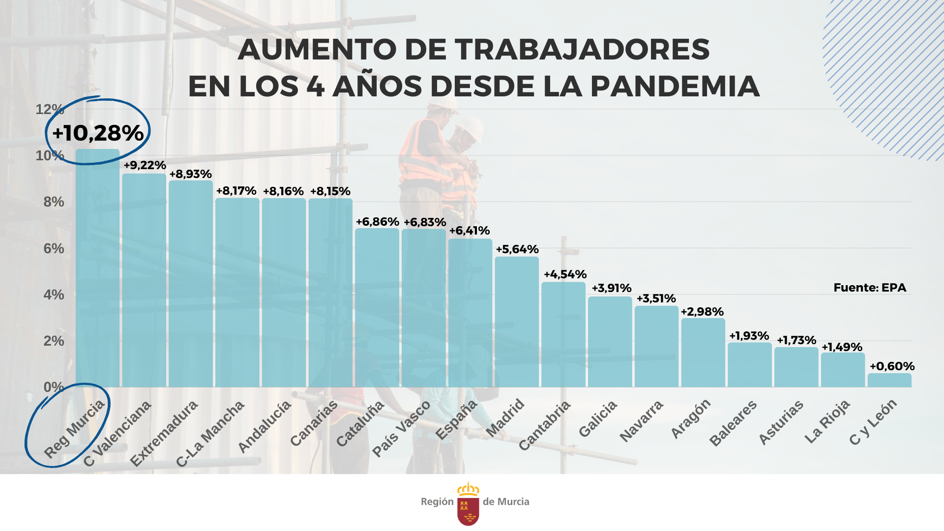 Gráfico que refleja el incremento relativo de trabajadores ocupados por comunidades autónomas entre el cuarto trimestre de 2019 y el cuarto trimestre de 2023
