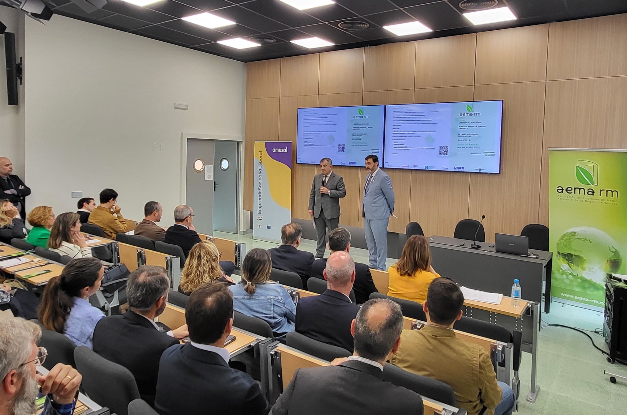 El consejero de Medio Ambiente, Universidades, Investigación y Mar Menor, Juan María Vázquez, junto al presidente de AEMA-rm, Daniel Robles, durante la inauguración del acto