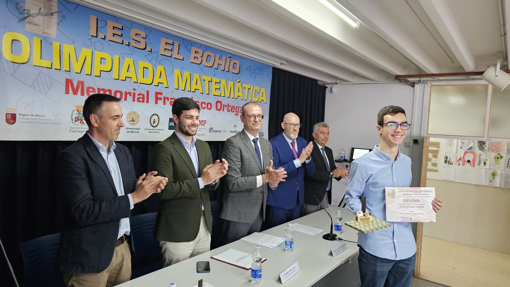 El consejero Víctor Marín, durante la entrega del premio de la XXXIV Olimpiada Matemática memorial 'Francisco Ortega' al ganador, Jaime Romero Peinado, del IES Alfonso X El Sabio (Murcia)