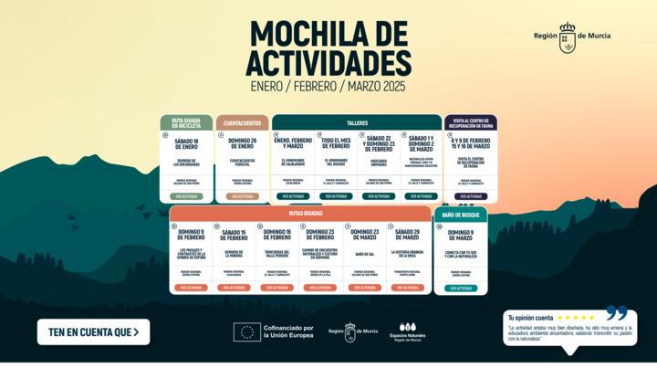 La Consejería de Medio Ambiente, Universidades, Investigación y Mar Menor presenta la nueva programación de la ‘Mochila de Actividades’ para los meses de enero, febrero y marzo de 2025. Los Espacios Naturales Protegidos de la Región de Murcia acogerán un total de 17 actividades destinadas a la educación y sensibilización ambiental, con el objetivo de fomentar el conocimiento y la conservación del entorno natural.