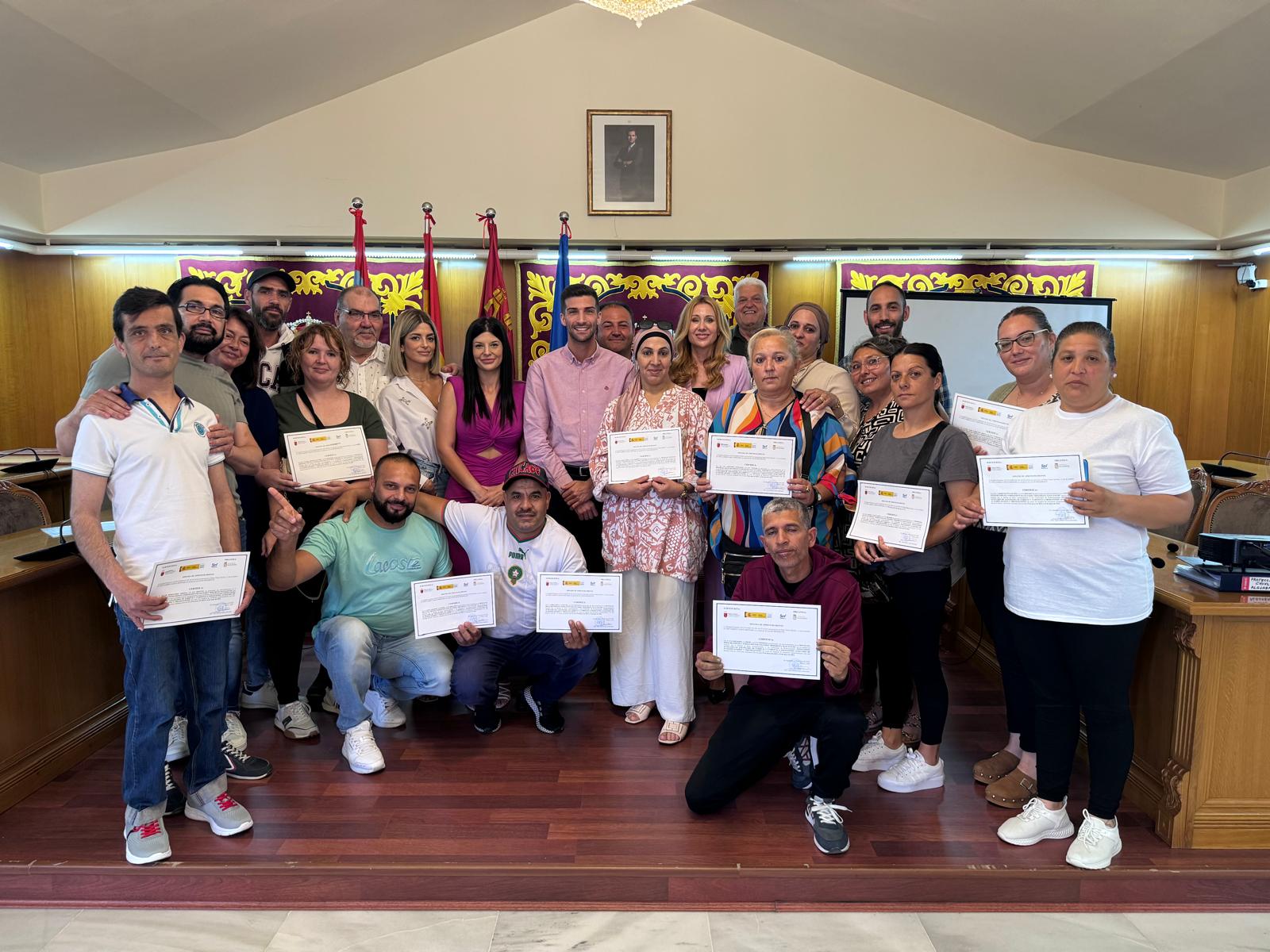 La directora general del SEF, Marisa López Aragón, y el alcalde de Alguazas, José Gabriel García, junto con los participantes de los programas mixtos de empleo y formación que se han clausurado hoy en el municipio.