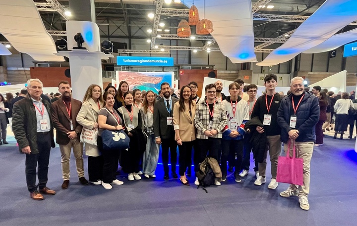 La consejera Carmen Conesa y el director del Instituto de Turismo, con un grupo de estudiantes de Turismo ante el estand de la Región en Fitur.