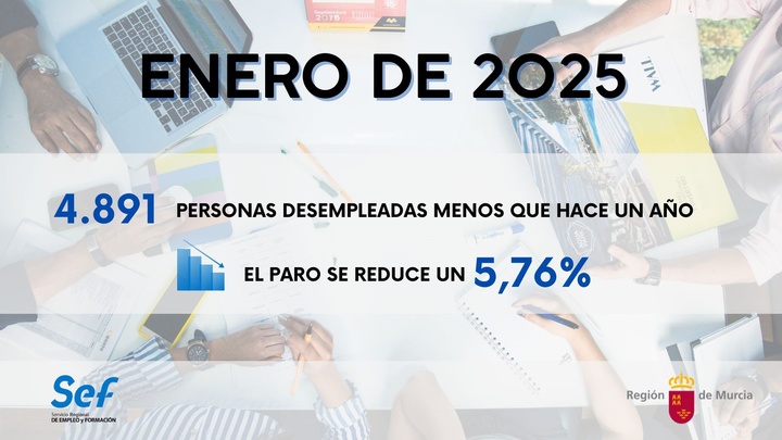 La Región de Murcia comienza 2025 con casi 5.000 parados menos que hace un año. De esta manera, la Región cuenta con 4.891 personas desempleadas menos, según los datos de empleo correspondientes al mes de enero que se han conocido hoy. En estos últimos doce meses, la cifra de parados ha caído un 5,76 por ciento.
