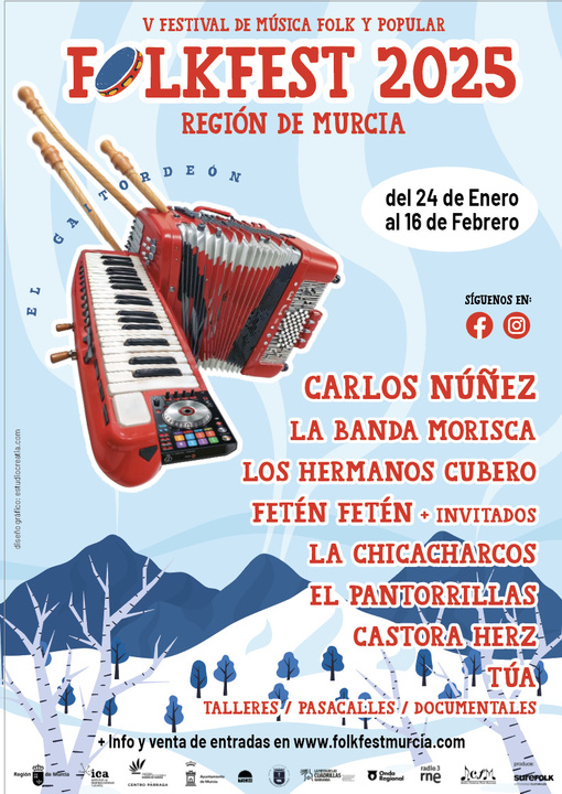 La actividad del festival arranca el jueves, 13 de febrero, en el Teatro Circo de Murcia, con el concierto de Fetén Fetén, el dúo castellano formado por Jorge Arribas y Diego Galaz y referencia de la escena nacional. Al día siguiente, el viernes 14, será el turno de otras dos bandas clave en la actual escena folk española: Los Hermanos Cubero y La Banda Morisca. Tanto los catalanes como los andaluces actúan en el Auditorio regional Víctor Villegas a las 20:30 horas.