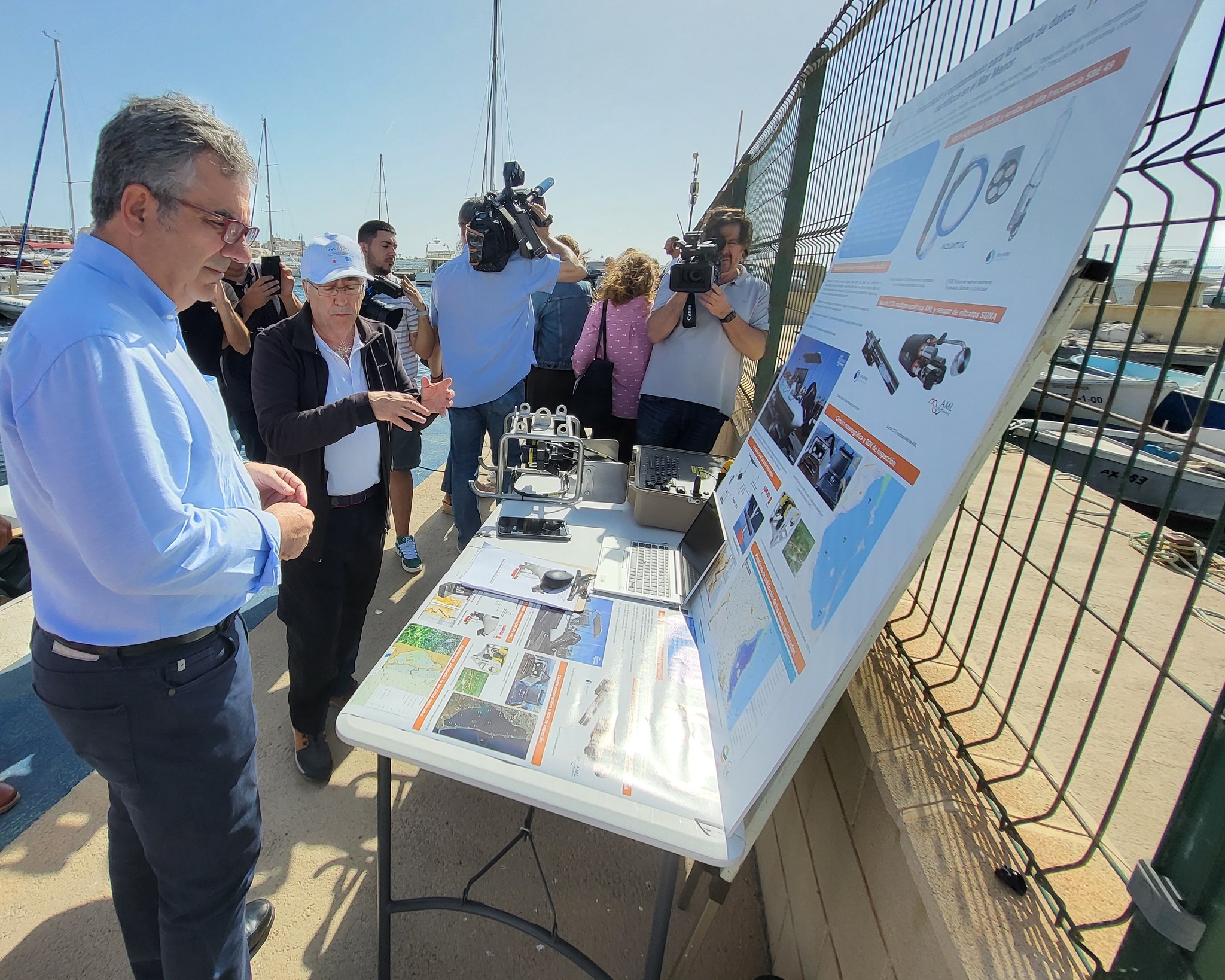 El consejero de Medio Ambiente, Universidades, Investigación y Mar Menor, Juan María Vázquez, atiende las indicaciones del responsable del Equipo de Sistemas de Información Geográfica y de Teledetección del