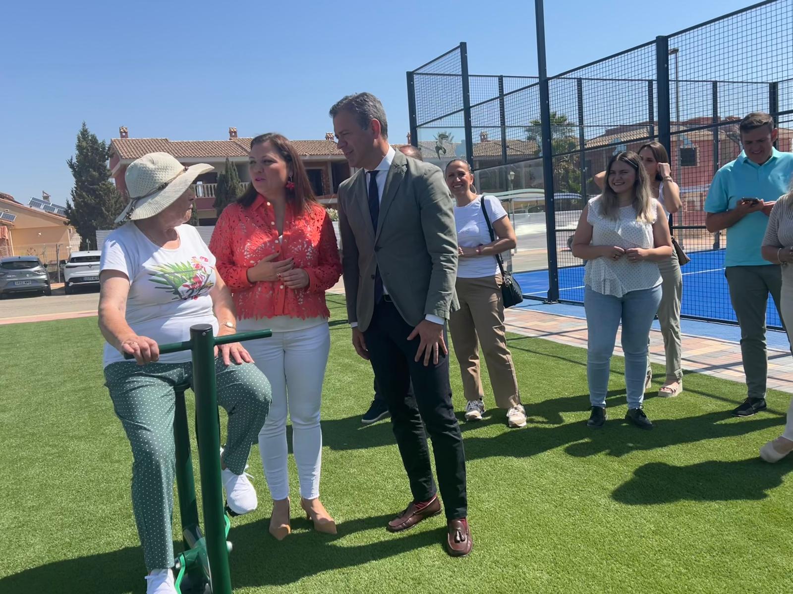 El consejero de Presidencia, Portavocía y Acción Exterior, Marcos Ortuño, y la alcaldesa de Fortuna, Catalina Herrero, en el área deportiva y de gerontogimnasia habilitada en la Gineta dentro del Plan de Obras y Servicios de la Comunidad
