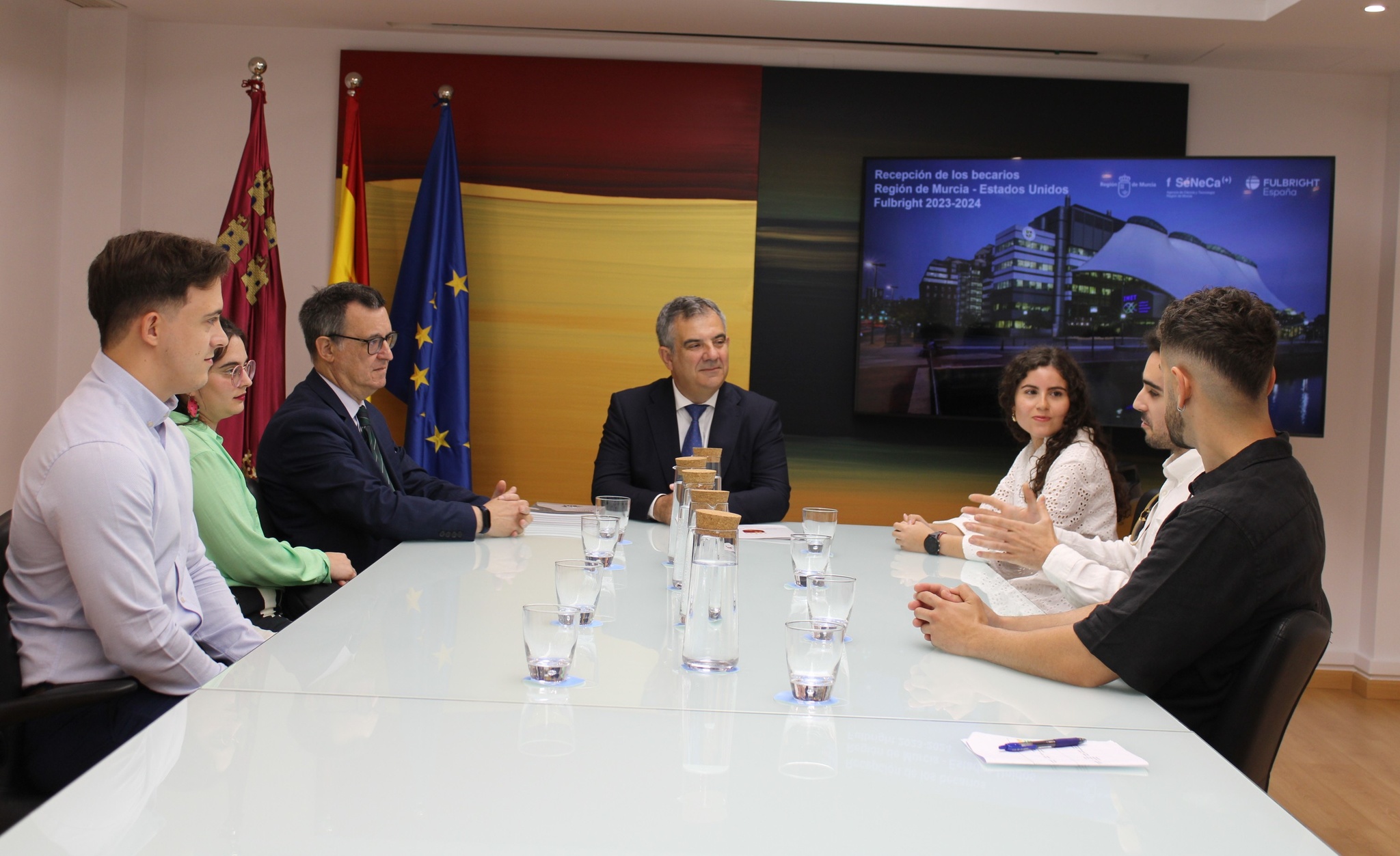 El consejero de Medio Ambiente, Universidades, Investigación y Mar Menor, Juan María Vázquez, mantiene un encuentro con tres de los cuatro seleccionados que iniciarán después del verano su estancia investigadora, y a los que acompañaron dos de los adjudicatarios de la pasada edición