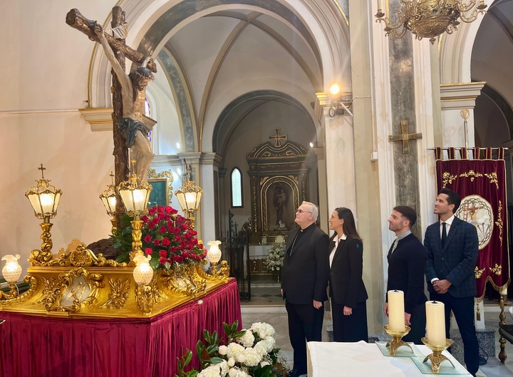 La consejera Carmen Conesa y el obispo de Cartagena, José Manuel Planes, contemplan la imagen restaurada del Cristo de la Salud de Espinardo.