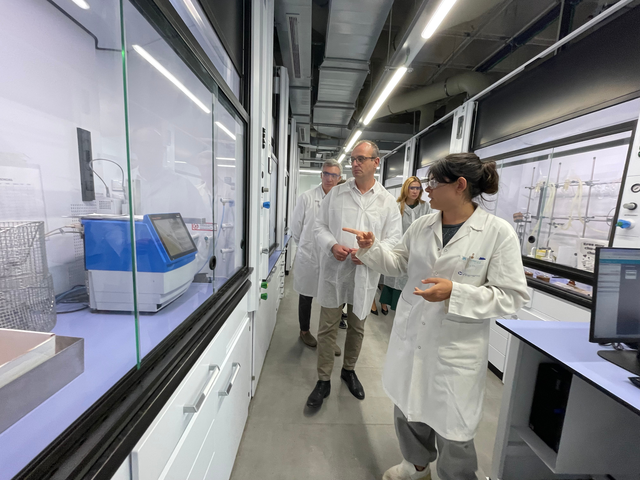 El consejero de Educación, Formación Profesional y Empleo, Víctor Marín, la directora del SEF, Marisa López, y los responsables de la empresa Eurofins VillaPharma Research S.L. durante su visita al centro de investigación ubicado en el Centro Tecnológico de Fuente Álamo (1)