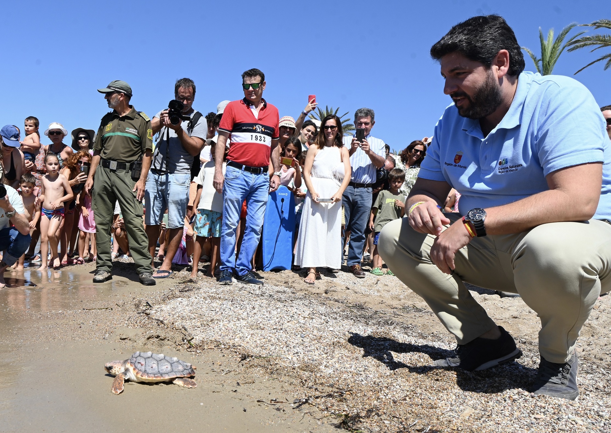 El presidente Fernando López Miras, en playa de Isla Plana, en Cartagena, donde se han soltado 30 ejemplares de tortuga boba