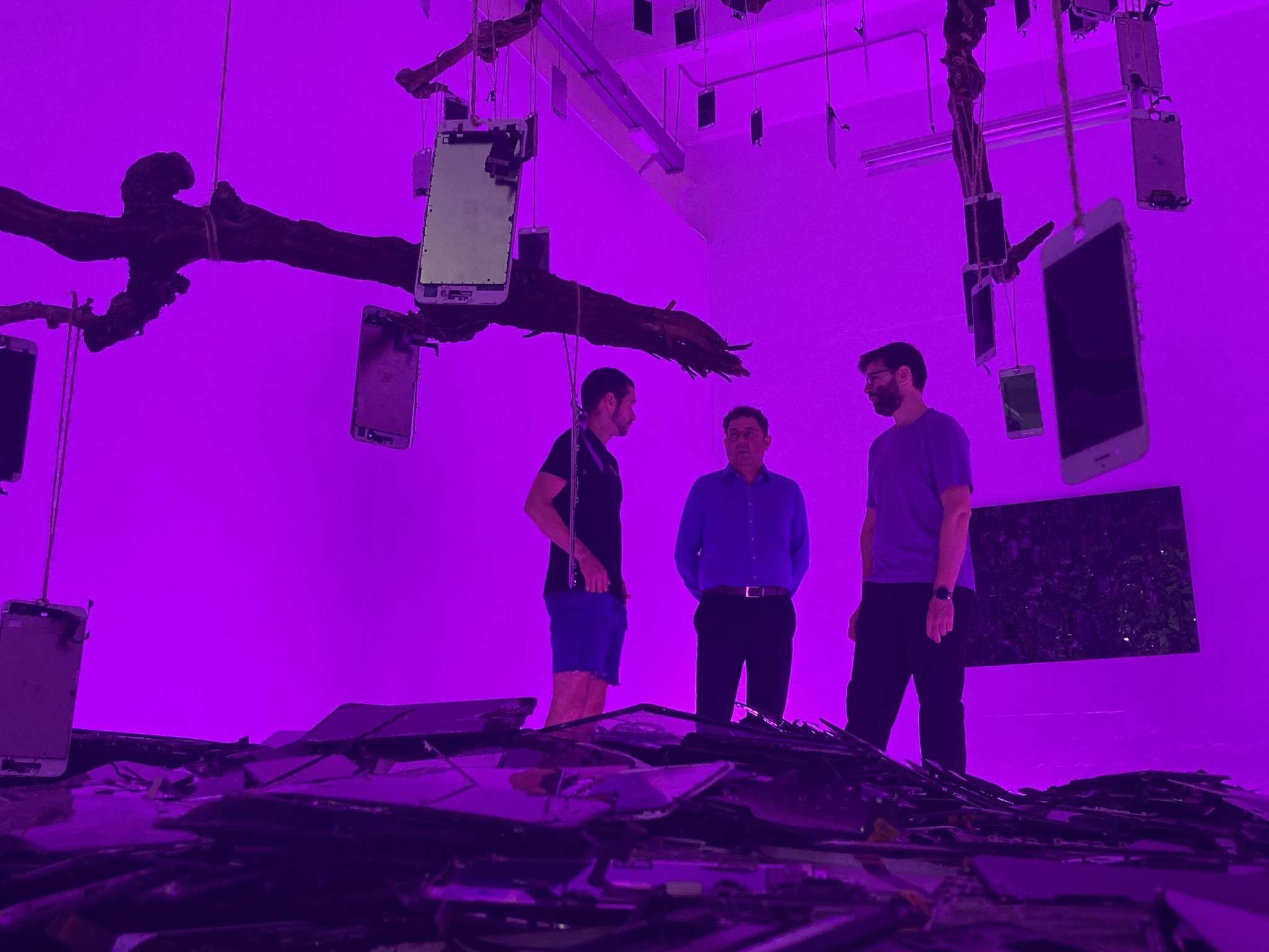 , Manuel Cebrián, y el comisario Rodrigo Carreño en la exposición 'Interiorismo'