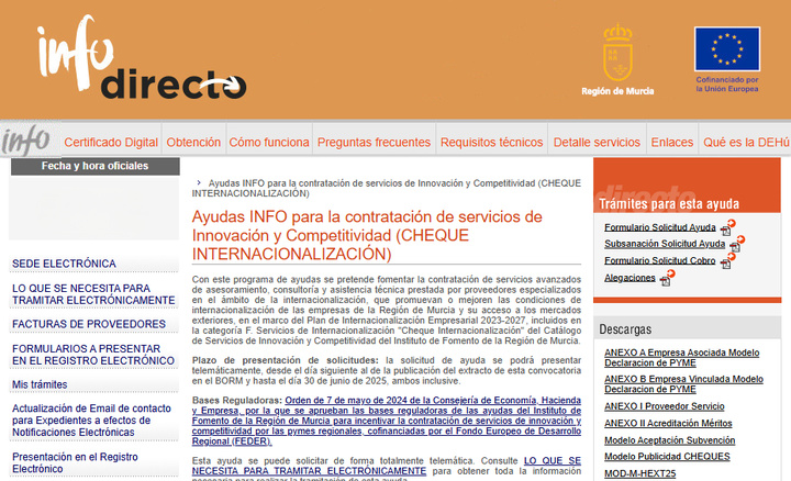 La Consejería Empresa, Empleo y Economía Social, a través del Instituto de Fomento (Info), abre una nueva convocatoria de ayudas para que las pymes regionales accedan a asesoramiento especializado en internacionalización. De esta forma, ayer se publicó en el Boletín Oficial de la Región de Murcia (BORM) la convocatoria del ‘Cheque Internacionalización’, dotada con 275.000 euros, que permitirá subvencionar con hasta con 10.000 euros a las empresas de la Región de Murcia que contraten servicios de asesoramiento estratégico y consultoría de mercados.