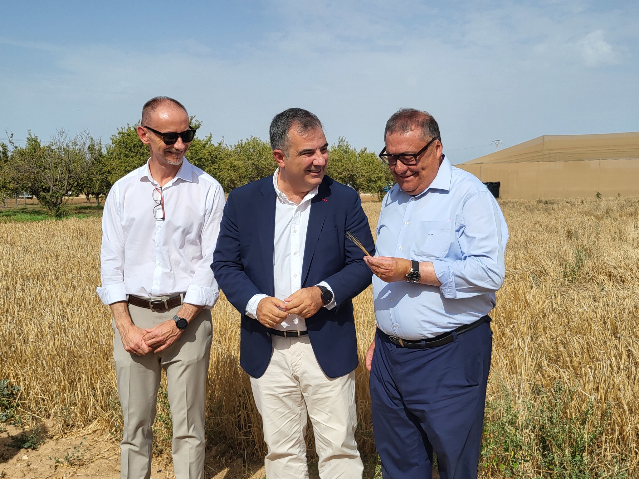 El consejero de Medio Ambiente, Universidades, Investigación y Mar Menor, Juan María Vázquez, junto al rector de la Universidad Politécnica de Cartagena (UPCT), Mathieu Kessler, y al presidente de la Fundación Estrella de Levante, Ramón Agenjo, tras la visita la Estación Experimental Agroalimentaria Tomás Ferro.