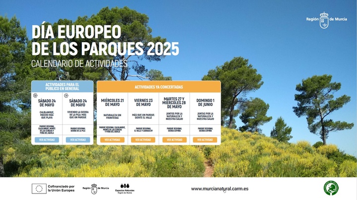 Toda la información sobre las actividades programadas, que se desarrollan con la cofinanciación de la Unión Europea, para el Día Europeo de los Parques y de ‘Mochila de Actividades’ pueden consultarse en la web murcianatural.carm.es