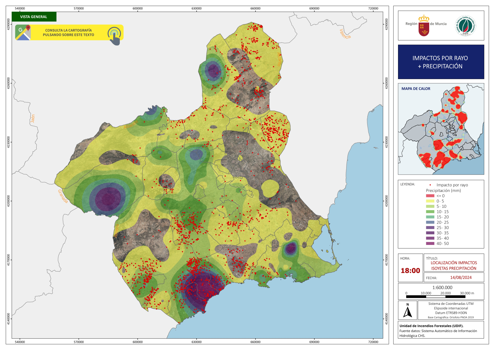Mapa representativo de los rayos y precipitaciones caídas en la Región de Murcia durante el día 14 de agosto, proporcionado por la