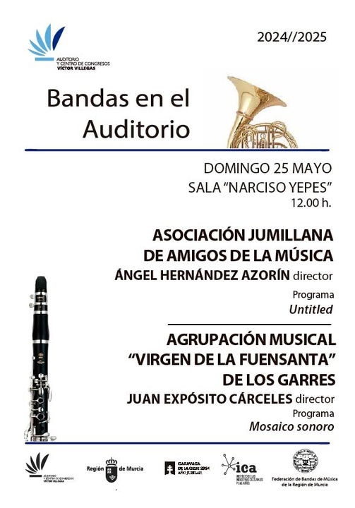 Será a las 12:00 horas cuando tome el escenario de la Sala Narcisos Yepes la Asociación Jumillana de Amigos de la Música bajo la dirección de Ángel Hernández Azorín. Tras esta actuación, será el turno de la Agrupación Musical Virgen de la Fuensanta de Los Garres que realizará el programa titulado ‘Mosaico sonoro’, con Juan Expósito Cárceles a la batuta.