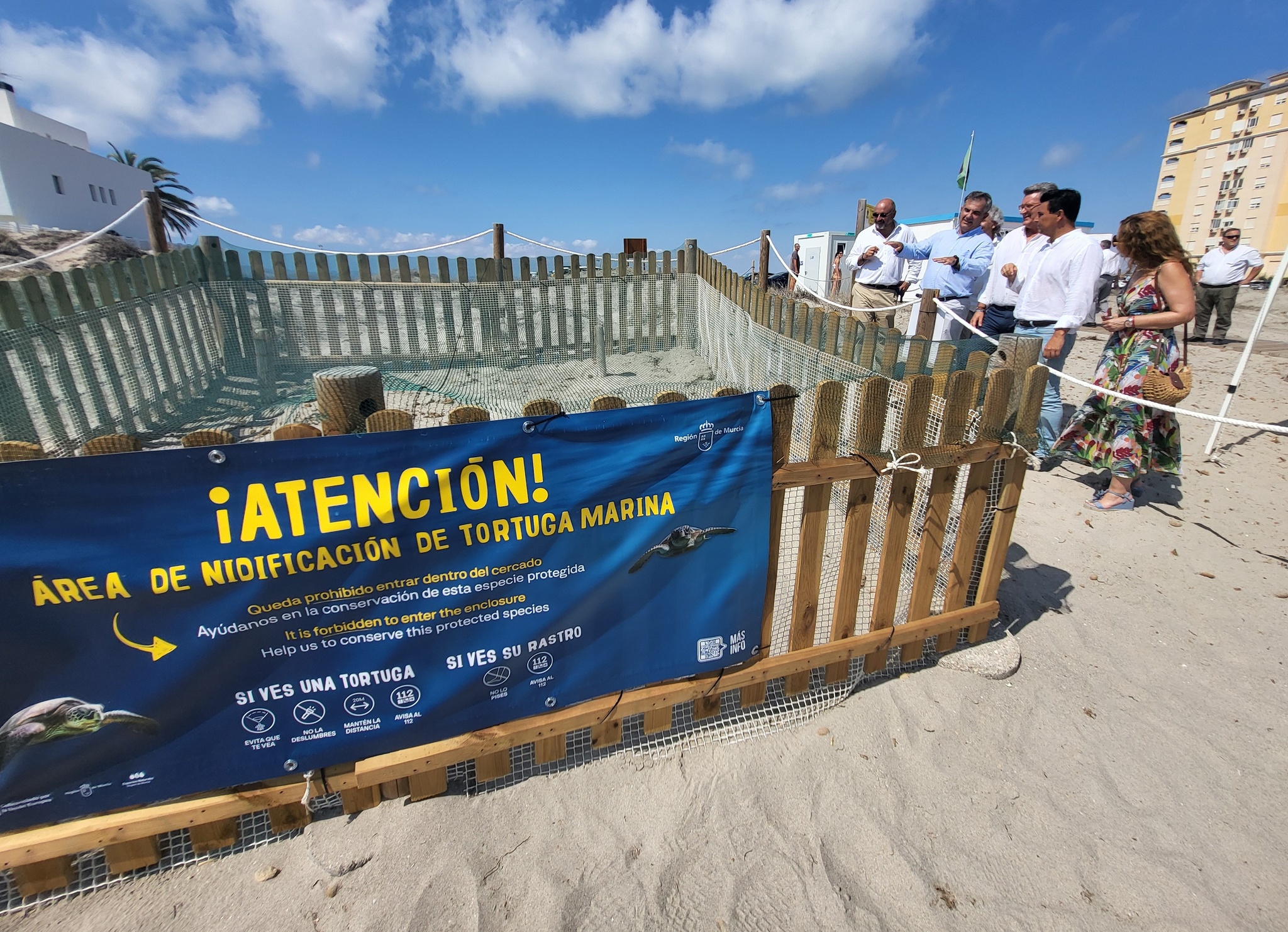 El consejero de Medio Ambiente, Universidades, Investigación y Mar Menor, Juan María Vázquez, junto con el consejero de Medio Ambiente, Infraestructuras y Territorio de la Comunidad Valenciana, Vicente Martínez, y el alcalde de San Javier, José Miguel Luengo, durante la visita del nido de tortugas boba ubicado en La Manga