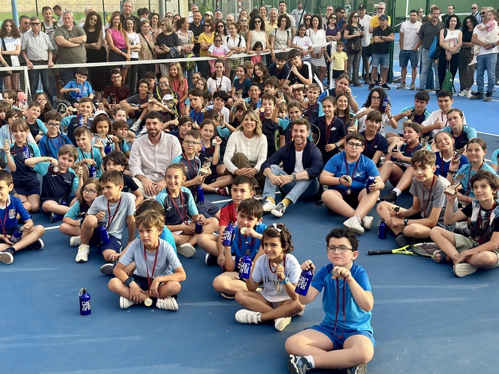 El director general de Deportes y la alcaldesa, con los jóvenes tenistas premiados en el acto de reinauguración de las pistas remodeladas.