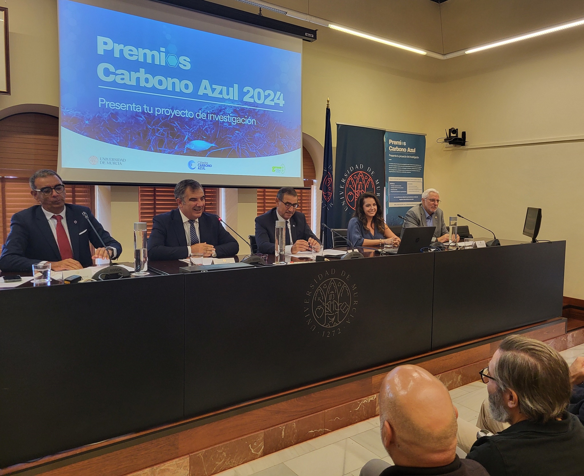 El consejero de Medio Ambiente, Universidades, Investigación y Mar Menor, Juan María Vázquez, presentó junto con el rector de la UMU, José Luján, los Primeros Premios de la Cátedra Carbono Azul