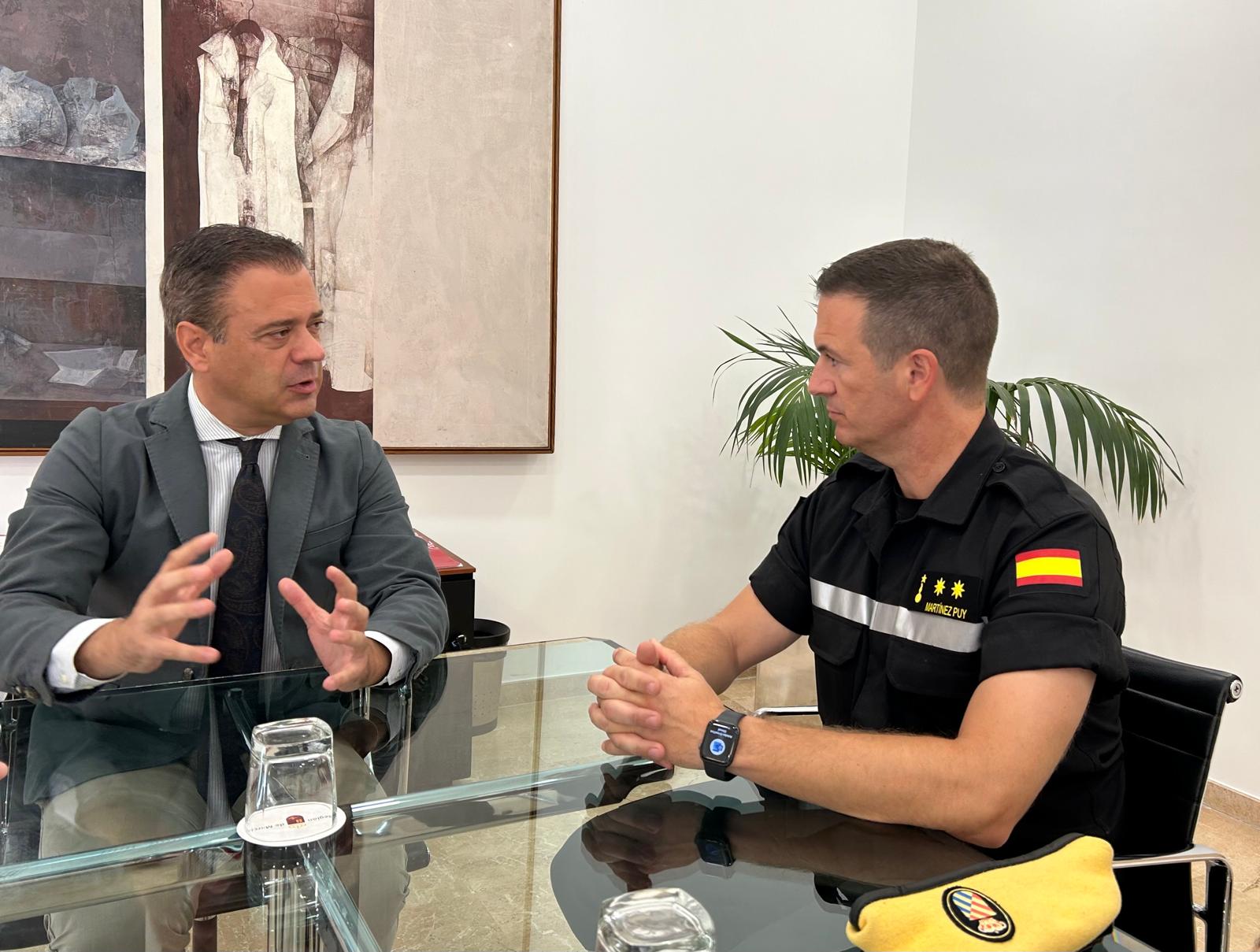 El consejero de Presidencia, Portavocía, Acción Exterior y Emergencias, Marcos Ortuño, recibió hoy al teniente coronel Martínez Puy, quien hace unos días tomó el mando del Tercer Batallón de Intervención de la Unidad Militar de Emergencias (UME), cuya zona de responsabilidad operativa son las comunidades autónomas de Valencia, Región de Murcia y Baleares.