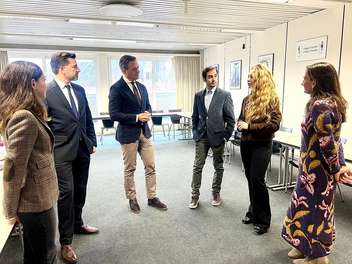 El consejero de Presidencia, Portavocía, Acción Exterior y Emergencias, Marcos Ortuño, y otros miembros de la Consejería, mantuvieron un encuentro con los alumnos beneficiados el último curso con esta beca en el Colegio de Europa.