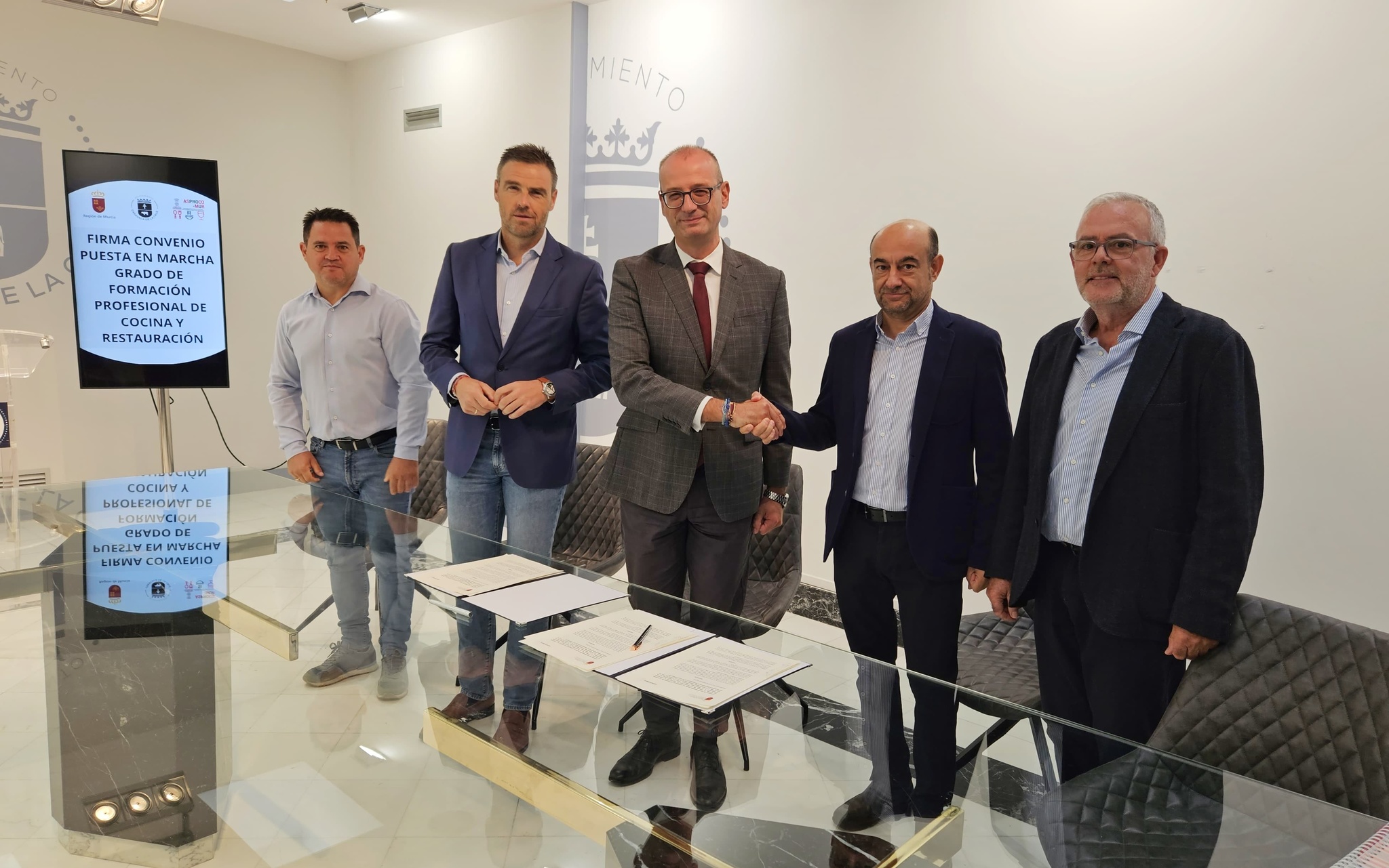 El consejero de Educación y Formación Profesional, Víctor Marín, junto con el alcalde de Caravaca de la Cruz, José Francisco García, firma un convenio con el presidente de Asprocomur, Pedro Marín, para impartir el grado básico de ‘Cocina y restauración’ utilizando las instalaciones de la asociación en Caravaca de la Cruz.