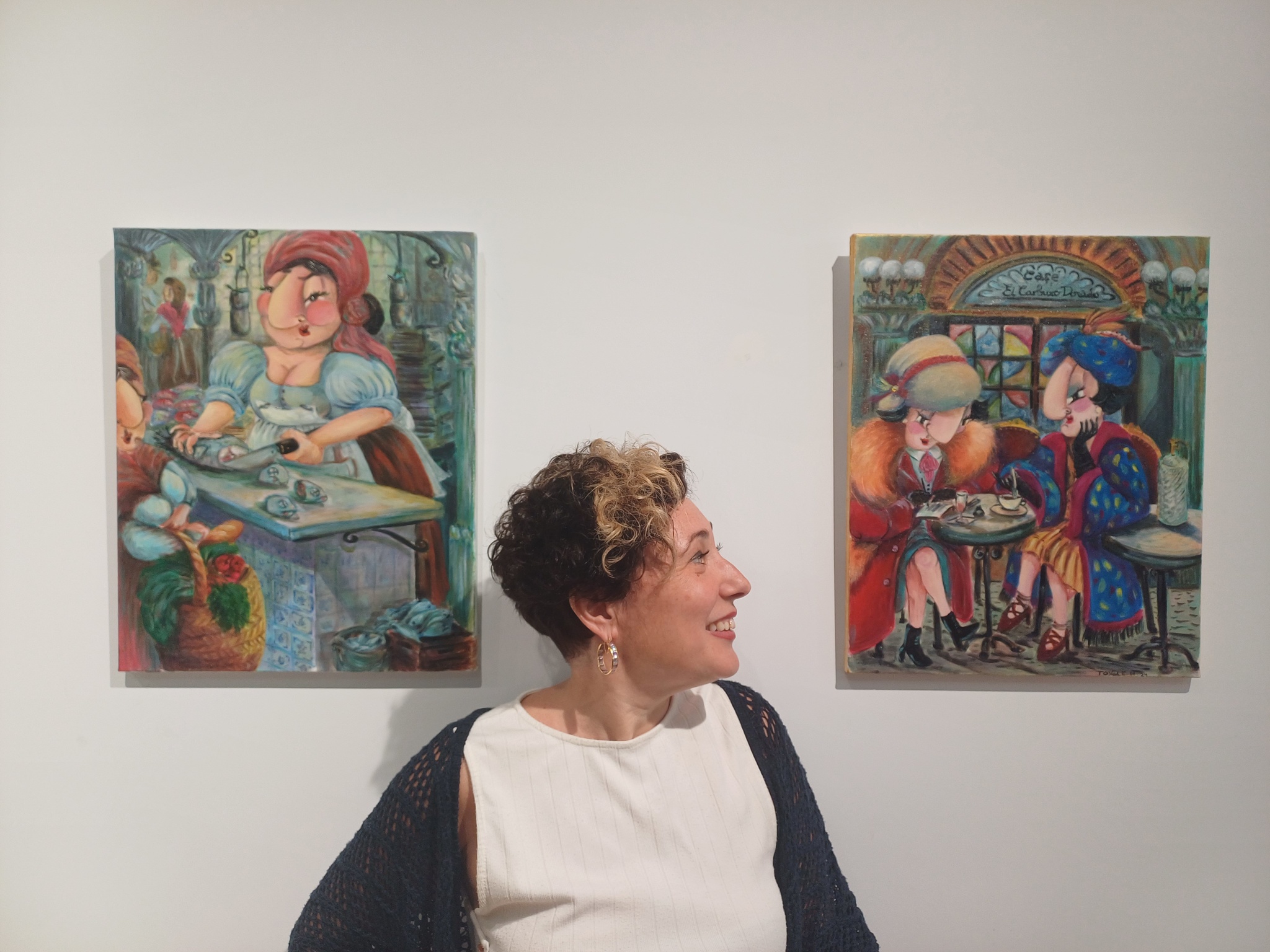 Imagen de la creadora Antonia Esther junto a dos de sus obras de 'La luz azul'
