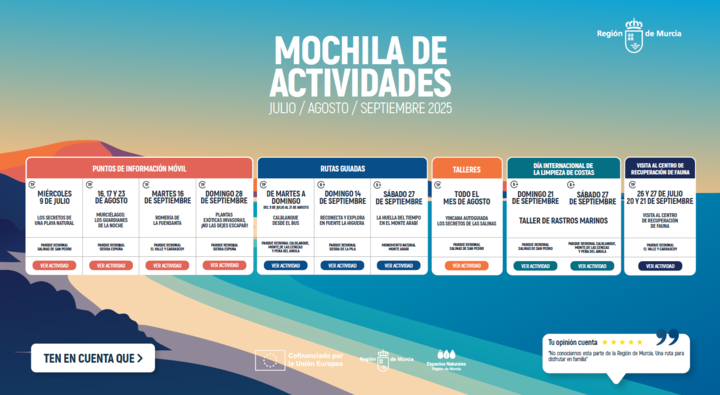 La Consejería de Medio Ambiente, Universidades, Investigación y Mar Menor presenta la nueva programación de la ‘Mochila de Actividades’ para los meses de julio, agosto y septiembre. Esta iniciativa ofrece 16 propuestas dirigidas a todos los públicos para acercar a la ciudadanía los valores de los Espacios Naturales Protegidos de la Región de Murcia. Dos de estas actividades se programan con motivo del Día Internacional de la limpieza de Costas.
